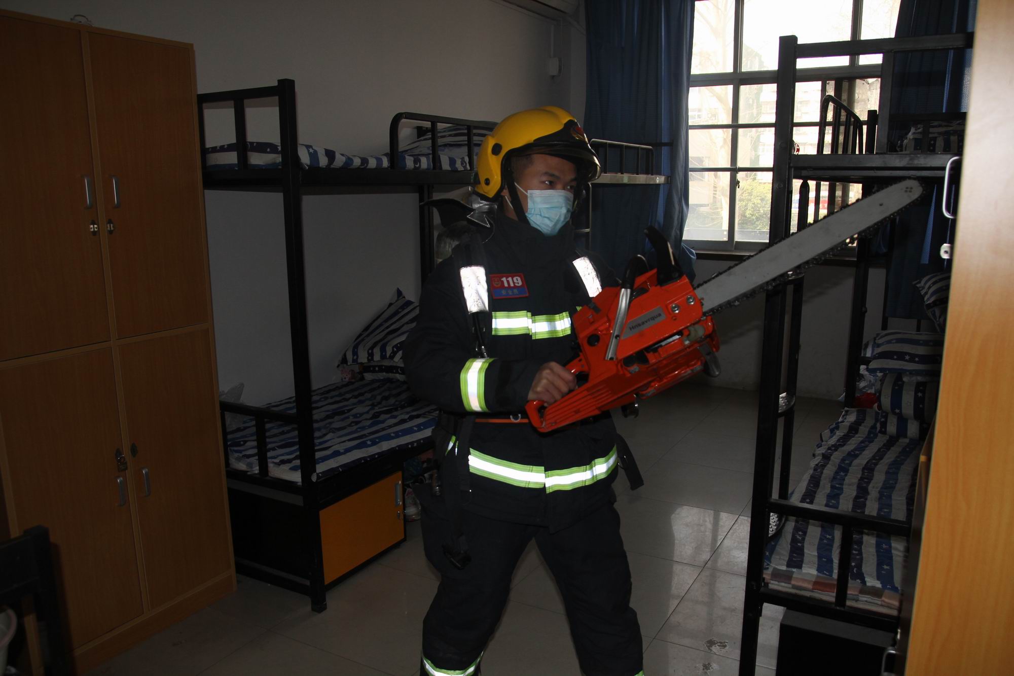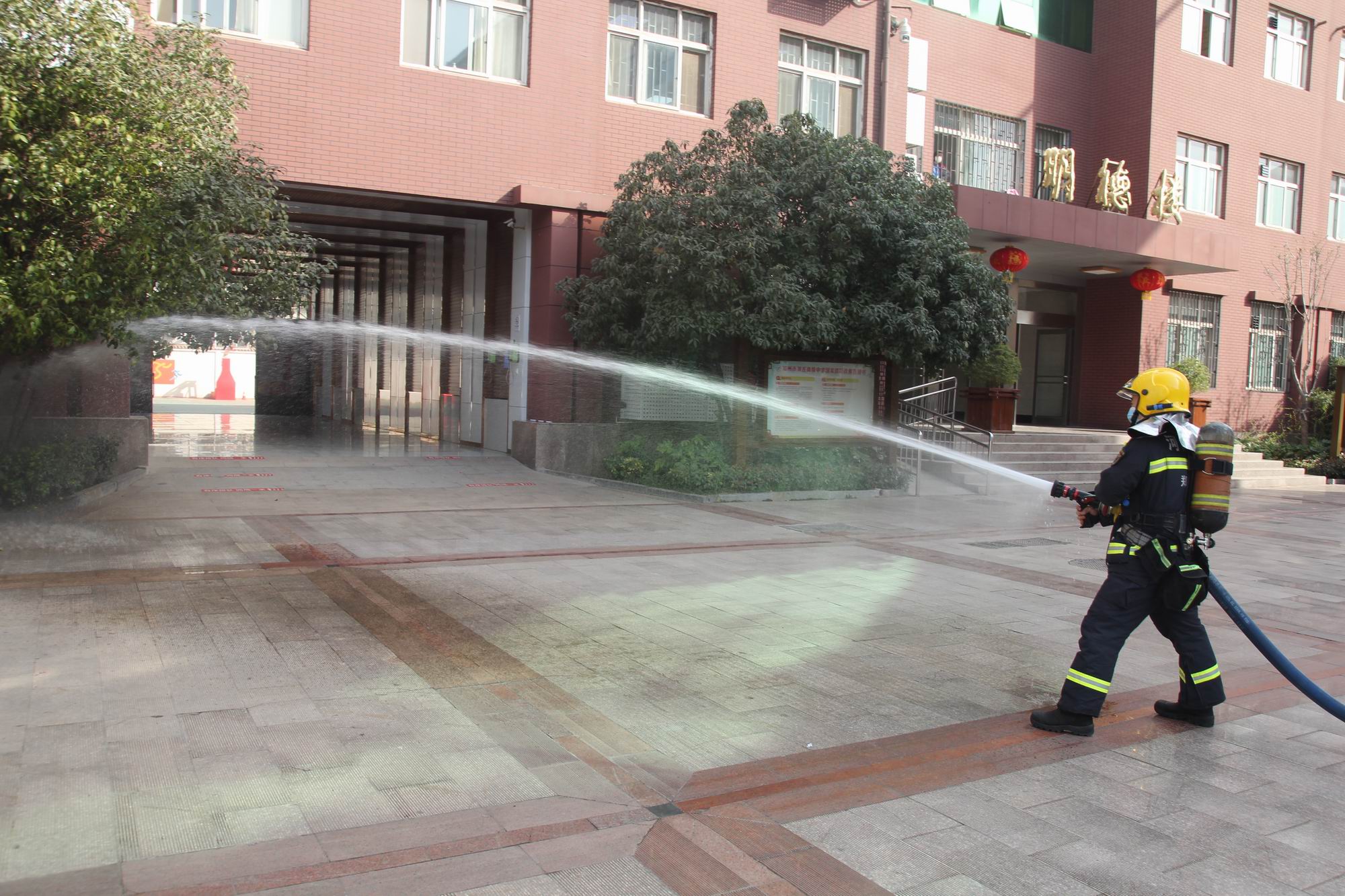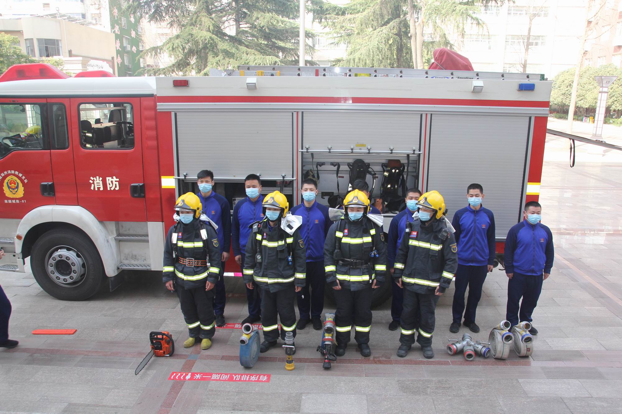 然后,在该校惠民广场男生寝室前,由“火焰蓝”与“救援橙”组成的消防队伍,进行“实战”演练。随着一声令下,“救援橙”消防队伍迅速取下消防水带和消防水龙头,匍匐延伸对接到寝室二楼某寝室,铺设好消防水带架设好消防喷枪后。值守在消防车负责开关阀门的“火焰蓝”人员立即打开阀门,一条“白龙”迅速跃进寝室,进行集中灭火。灭火环节结束后,“救援橙”救援人员到达现场,迅速举起电锯进行破解展开营救。整个演练迅猛、快捷、干净、利落,耗时不到5分钟,赢得师生的一片掌声。
