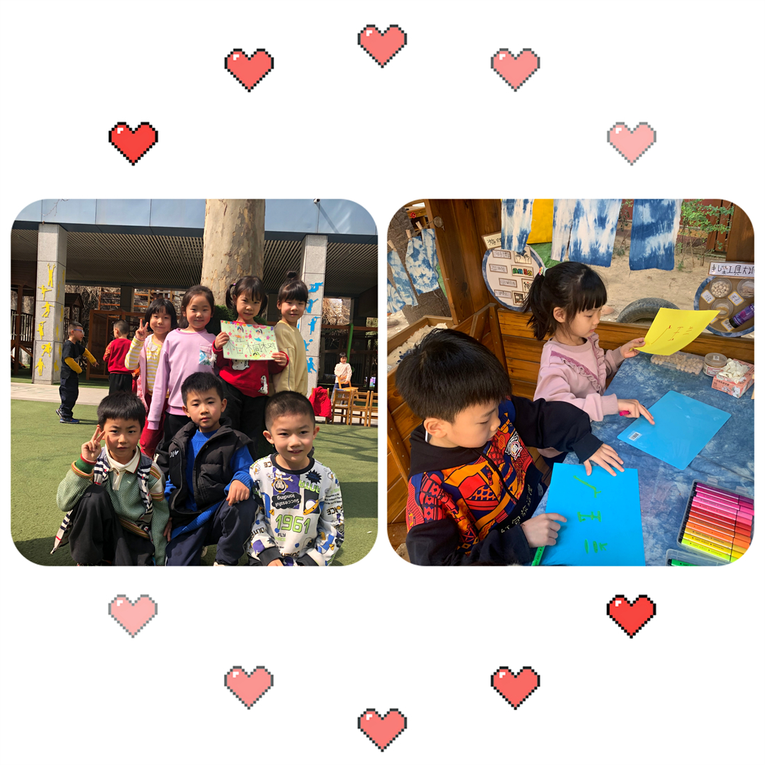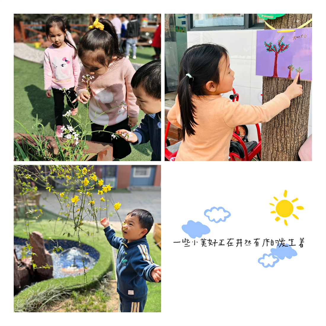 大班孩子在观察、了解树木特征和属性的基础上,用稚嫩的小手、多彩的画笔,为幼儿园里的每一棵小树制作了专属名片。中班娃娃在老师的带领下来到耕园,认识劳动工具,在种植区域进行松土、平整、挖坑、种植,他们一边念着“尖尖的脑袋钻土里”的儿歌,一边将向日葵、黄豆、绿豆、大蒜播撒到土里。小班的宝贝则开心地跟着老师游园赏花,粉色的桃花映红了圆圆的脸庞。他们有的拿着小水壶,有的端着小茶杯,来到小树下、小花旁浇水,还轻柔地说:“喝吧,喝吧,快喝吧!”稚嫩的声音道出了孩子们对春天的向往、对绿色的热爱。
