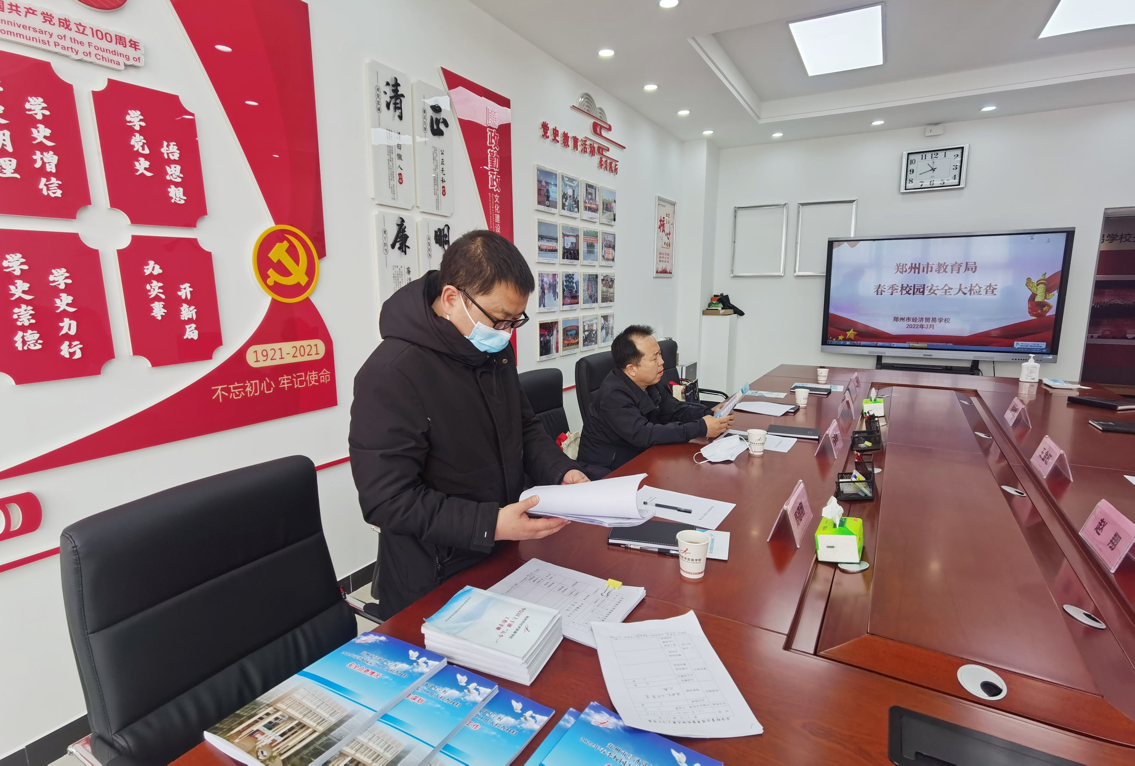 校园安全是学校教育教学工作开展的首要前提保障。根据郑州市教育局春季校园安全工作大检查整体部署,3月15日,郑州市经济贸易学校迎来了郑州市教育局春季安全工作大检查第一检查组,检查组在郑州市教育局安保处处长徐荣新的带领下,对郑州市经济贸易学校安全工作进行全面检查,郑州市经济贸易学校副校长王金旺、后勤处主任张克强、学生处主任赵翔共同迎接检查。