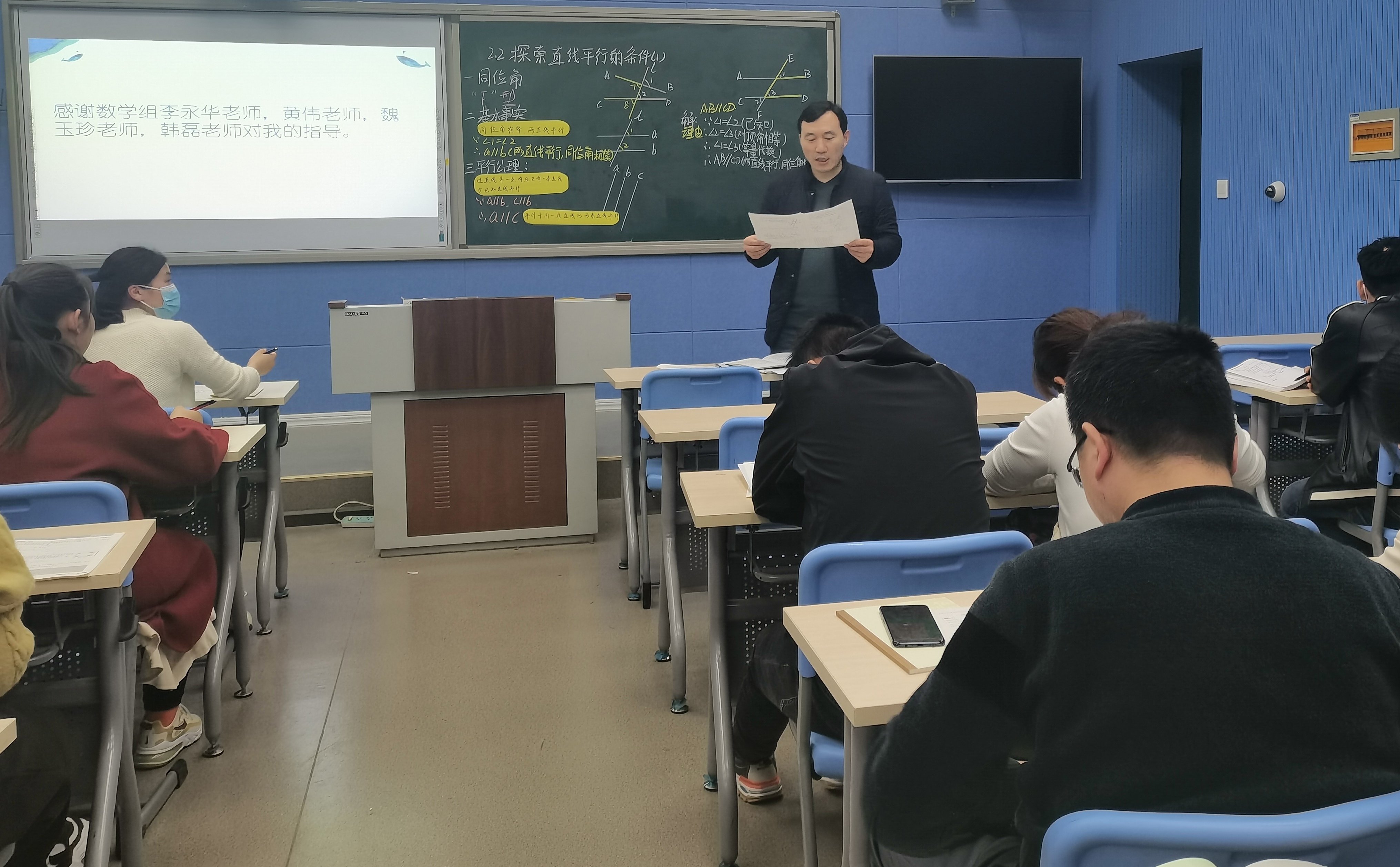 然后,听课老师对本节课进行点评。李永华老师认为魏伟老师作为年轻教师,基本功扎实,课堂节奏把握很好。韩磊老师和魏玉珍老师都对魏伟老师提出了很高的评价。
