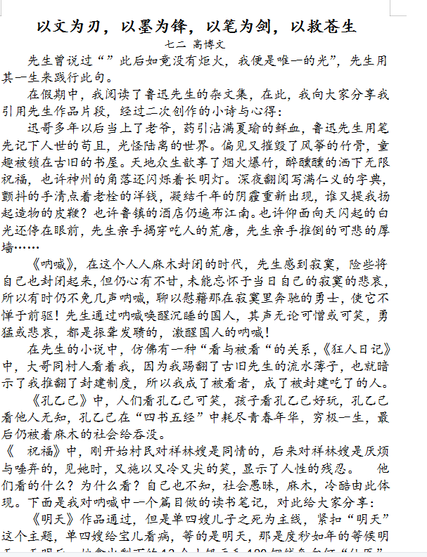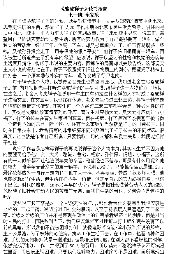 “大家好!我是七一班栗锦华。今天我为大家推荐的名著是《骆驼祥子》……我曾为祥子感到心酸,因为在他自暴自弃,逃避命运的时候,命运也回敬他,让他愈加堕落。我想,在和平时代我们也会遇到挫折和磨难,但越是此时越是要勇敢前行,不能轻易向命运低头,继续迎战生活,只要坚定信念,我们一定会离理想越来越近!”这是课前名著推荐的一幕。为深入开展读书活动,七年级各班在语文课前增加了名著推荐环节,以期让每位学生都能够参与其中,投入进去,读有所获。