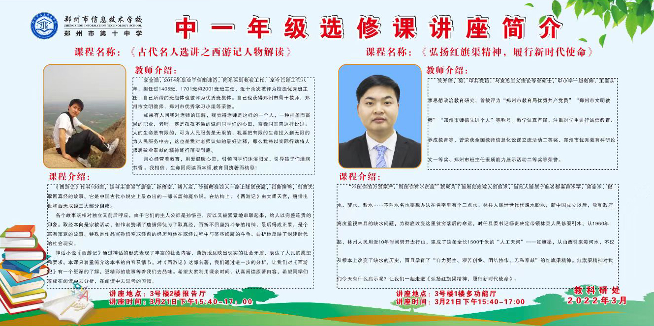 3月21日下午,郑州市信息技术学校迎来本学期第二次“走班制”选修课。李金鼎、朱开锋两位老师分别为同学们带来《古代名人选讲之西游记人物解读》和《弘扬红旗渠精神,履行新时代使命》。