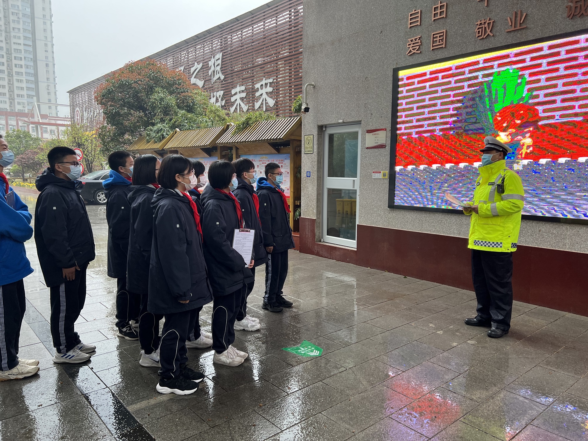 随后,谢东霖向学生发放交通安全宣传页,教育学生及家长养成自觉遵守交通法规、安全文明出行的良好习惯,共同营造安全、畅通、和谐的道路交通环境。