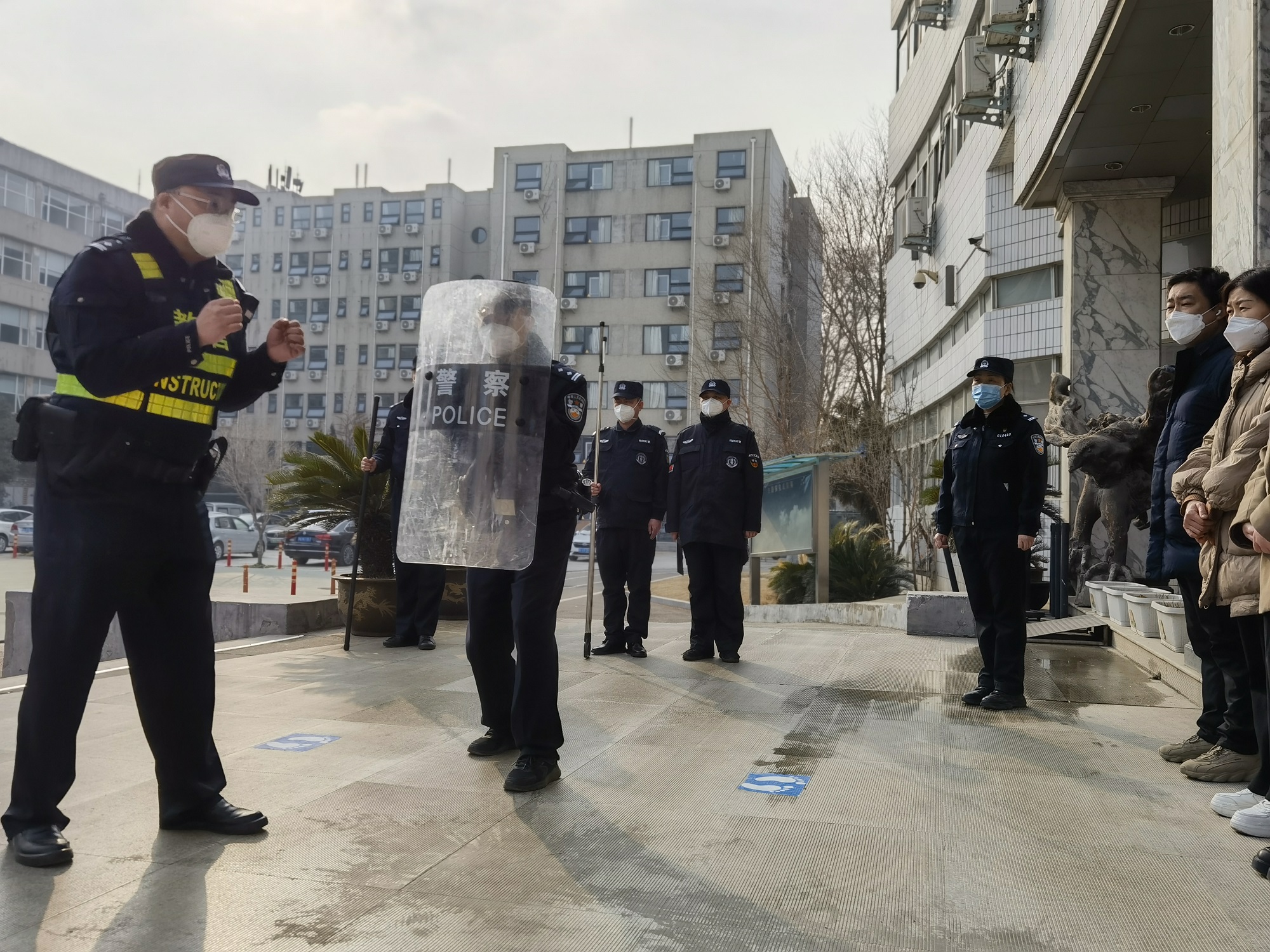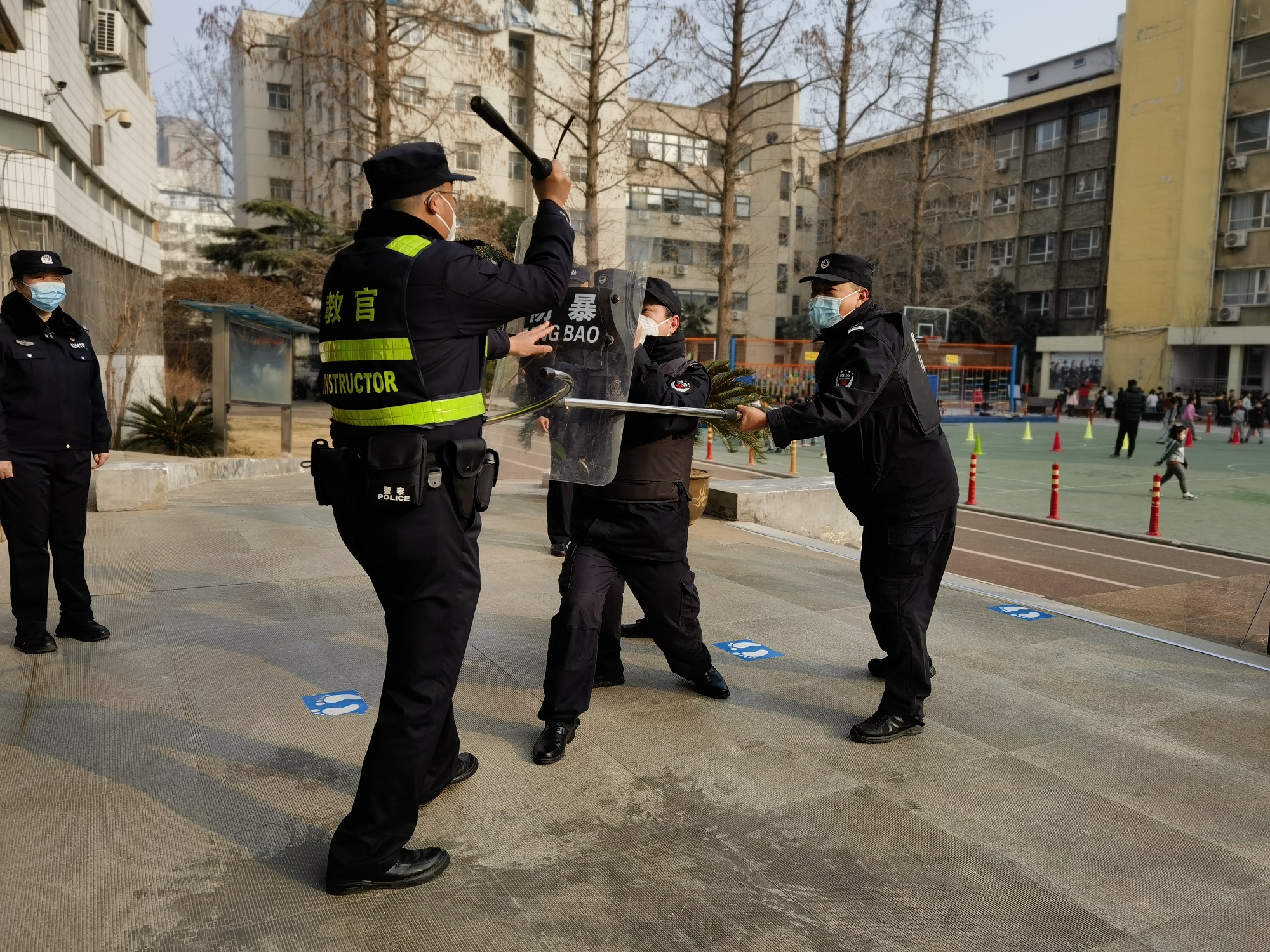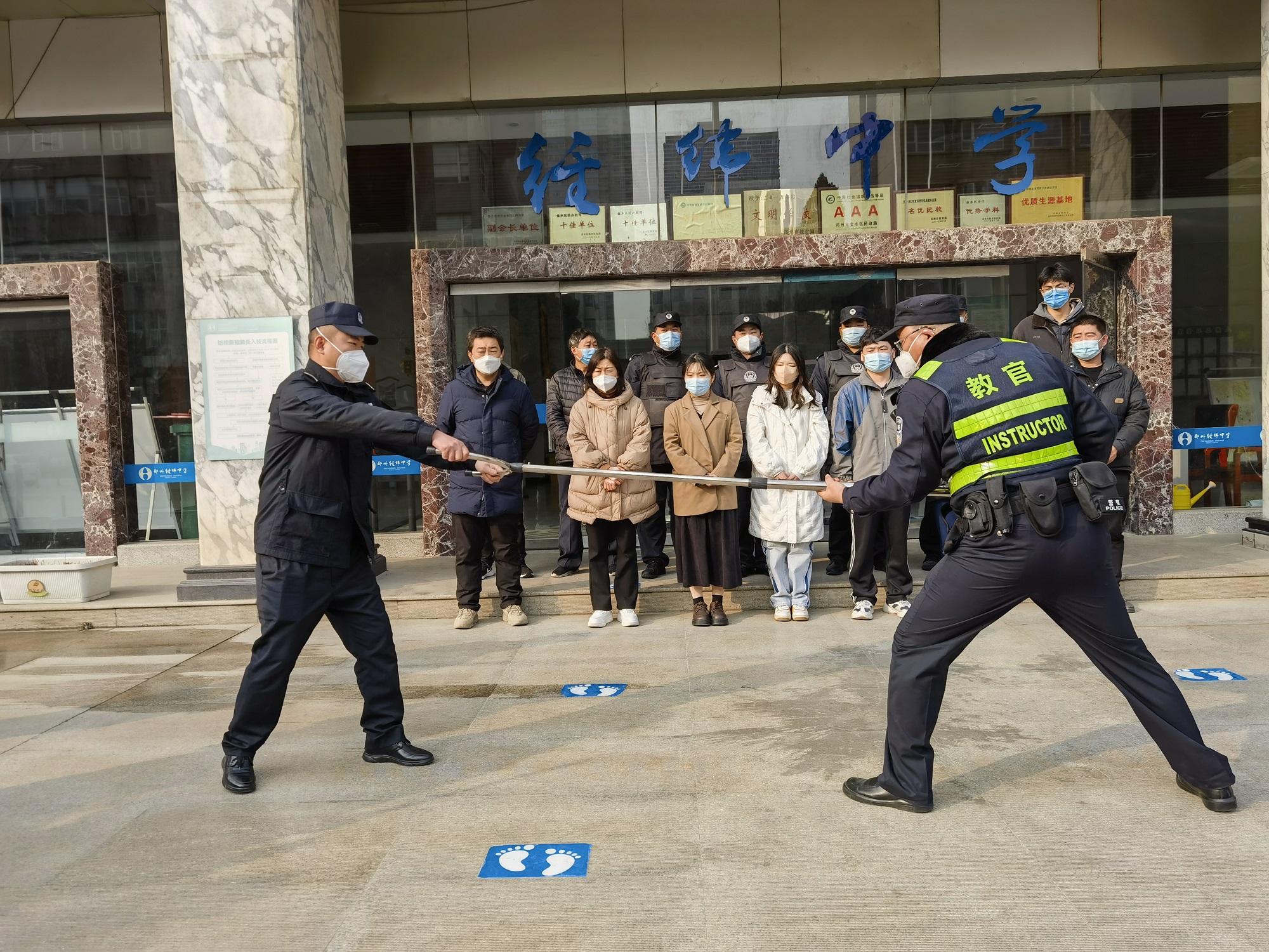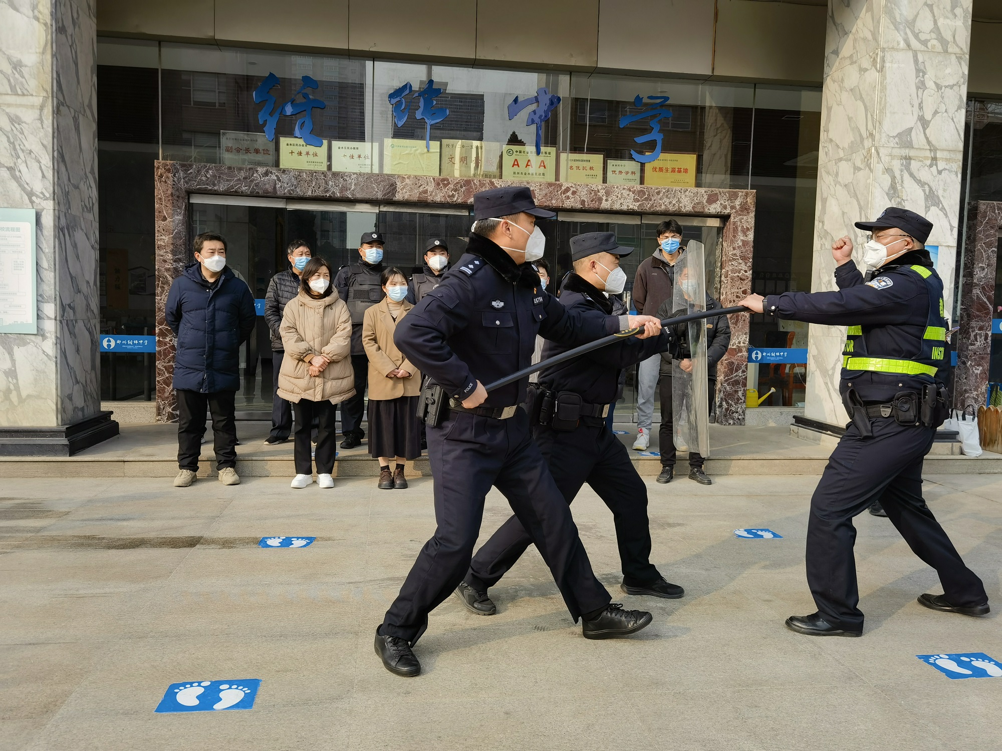 为进一步增强广大师生的自我防范意识,应对暴力事件的自我保护意识和逃生自救能力,完善学校联防制动机制,做好反恐防暴工作,本着“全员参与,安全第一”的原则,2月23日下午,金水区经纬学校与经八路联合开展校园反恐防暴演练及安保技能培训,学校法治辅导员孟郑杰、学校相关领导、安保人员、护校队员参加了此次演练活动。
