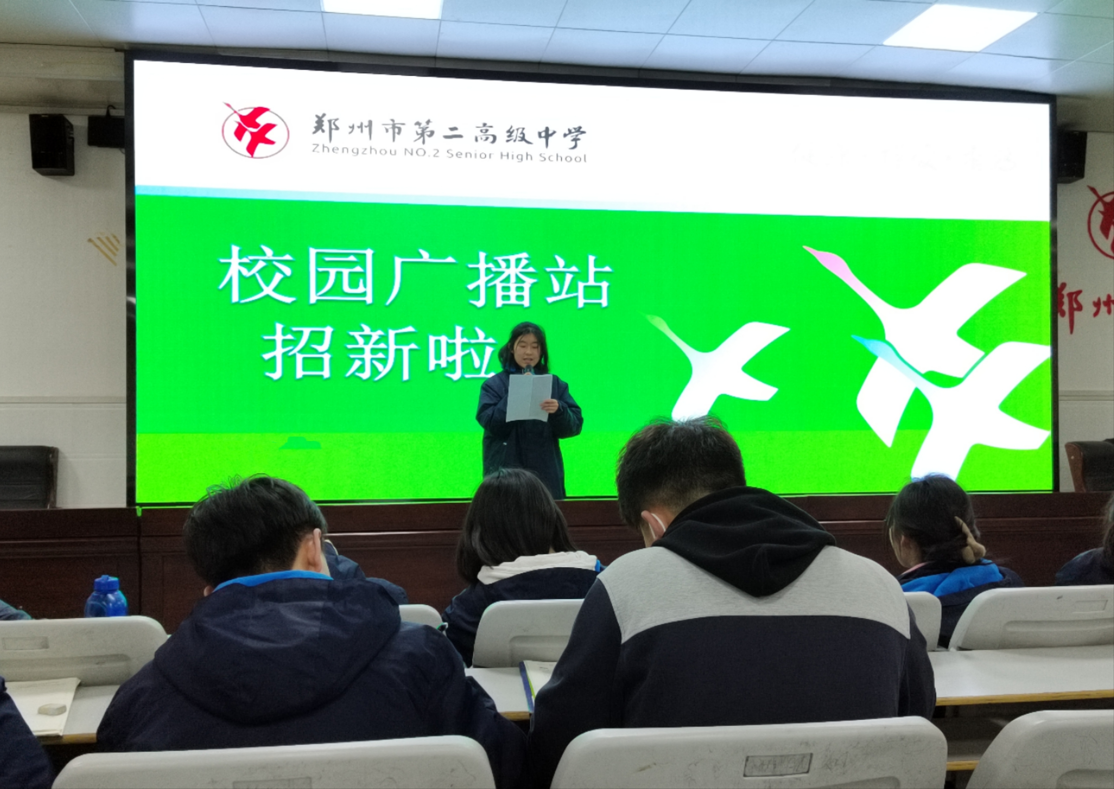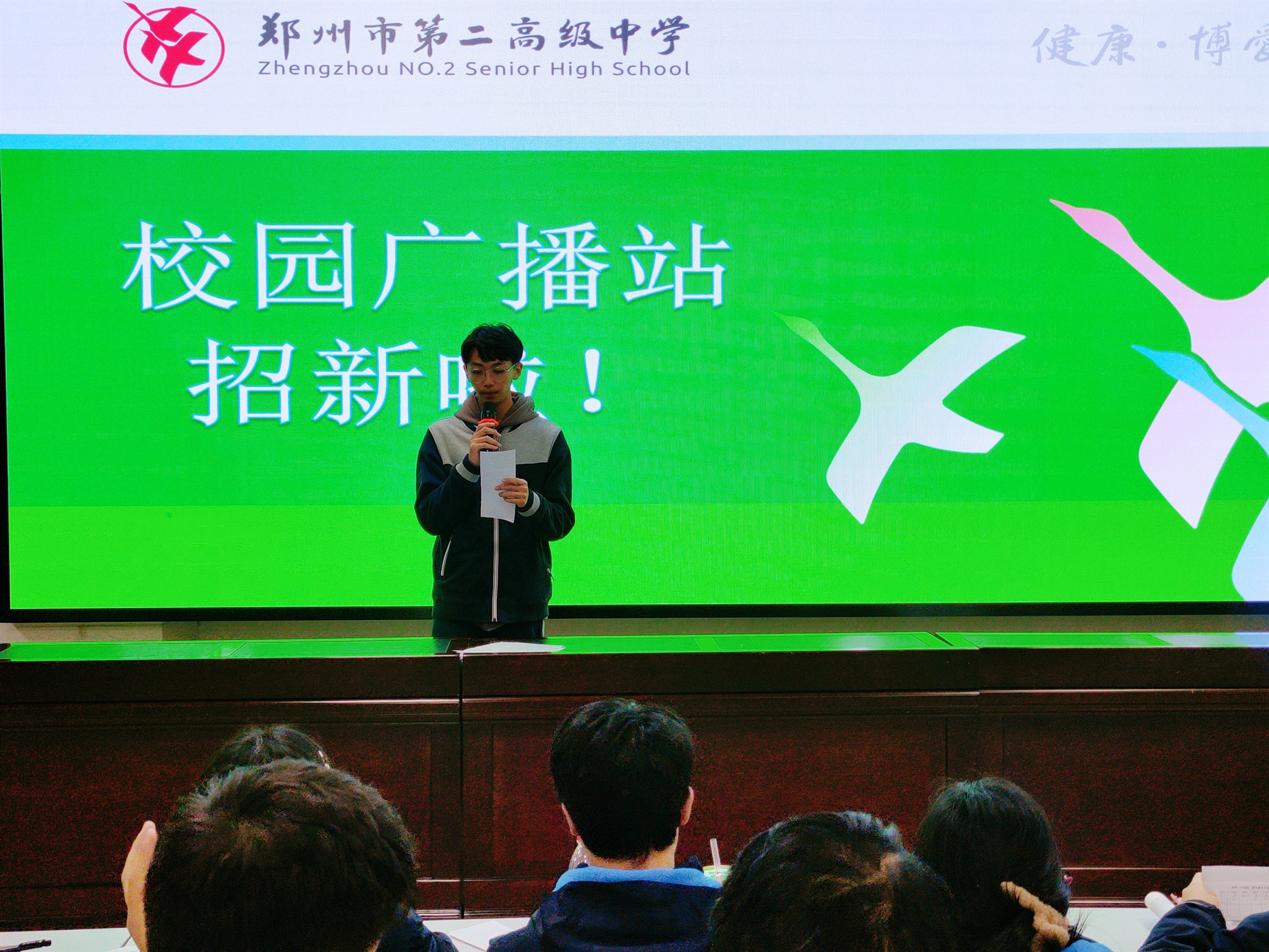为丰富校园文化生活,给更多学生提供展示自我、锻炼自我的机会,郑州市第二高级中学校园广播站于日前开始招新活动,2月28日下午,举行了选手展示选拔活动。