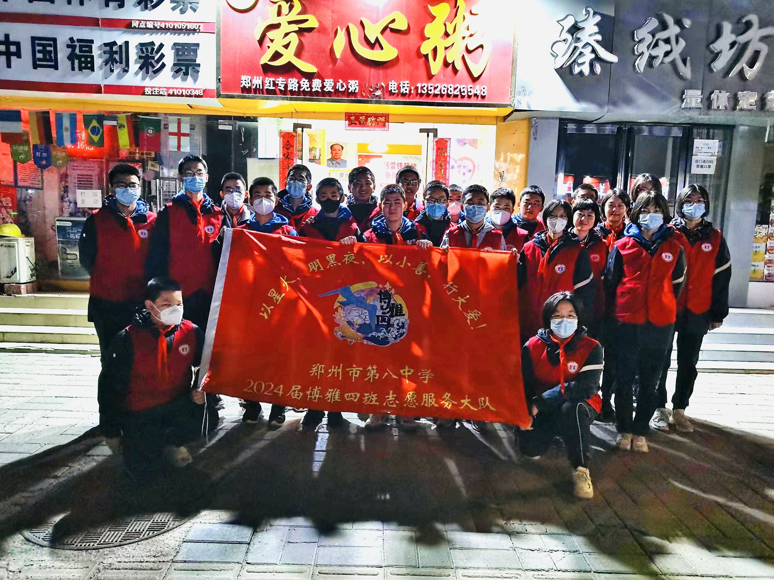 为响应国家和学校的号召,传承雷锋精神,3月12日,郑州八中“绿苗”志愿服务大队开展“公益爱心施粥”活动,为300多名环卫工人和有需要的人奉献了爱心,温暖了郑州的凌晨。