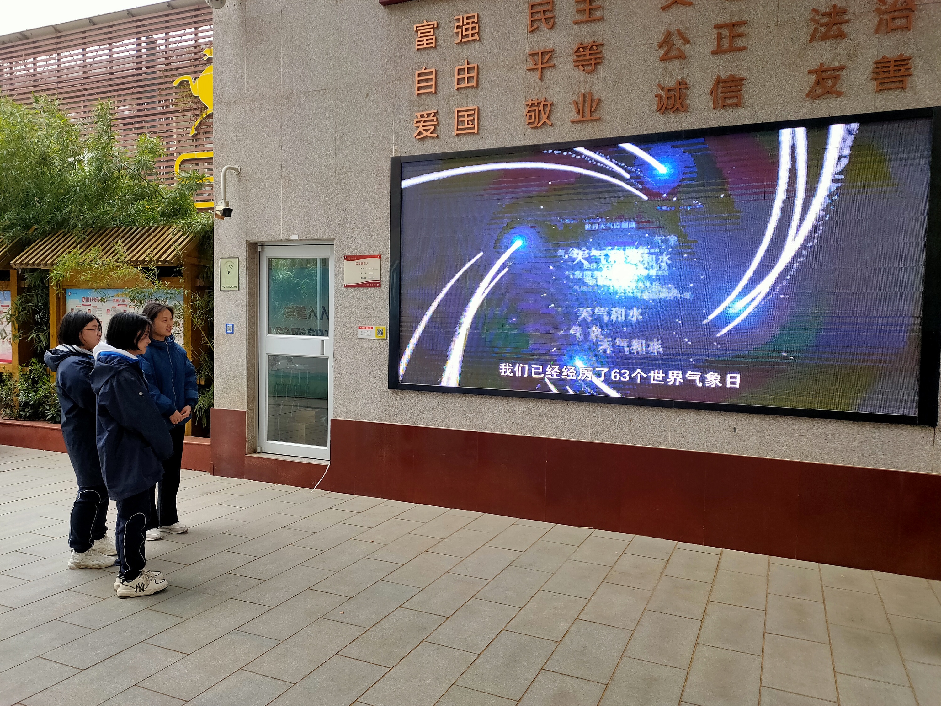 师生驻足校门口观看宣传视频