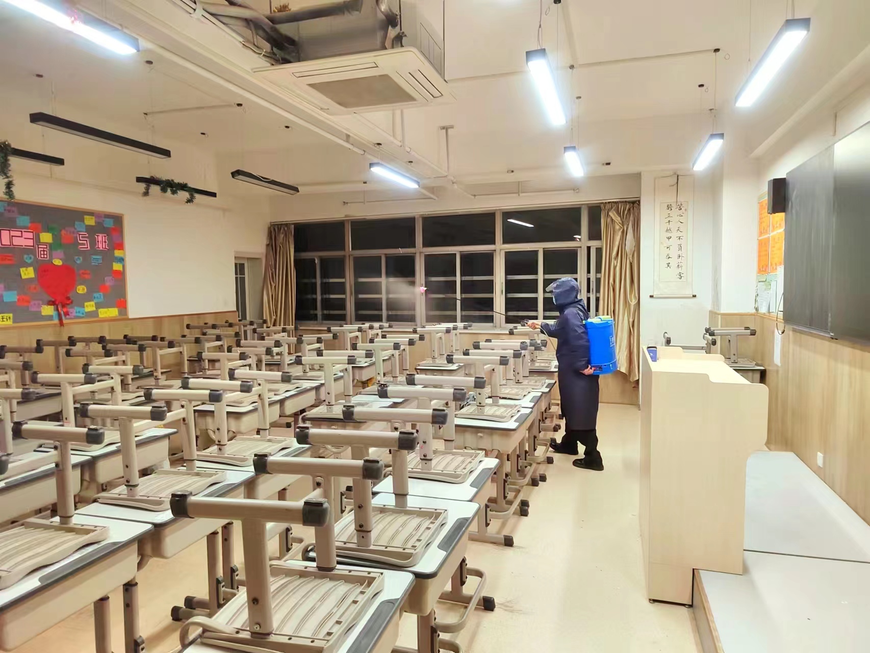 预防流感,没有谁是局外人。学校加强晨午晚检制度、做好因病缺勤登记,尽早尽快发现病例;每日课间要求晨检班长监督班级开窗通风情况,政教处人员进行各楼层巡检;在做好紫外线消杀的同时,安排保安人员对教室、办公室等公共场所使用次氯酸消毒液进行消杀工作。
