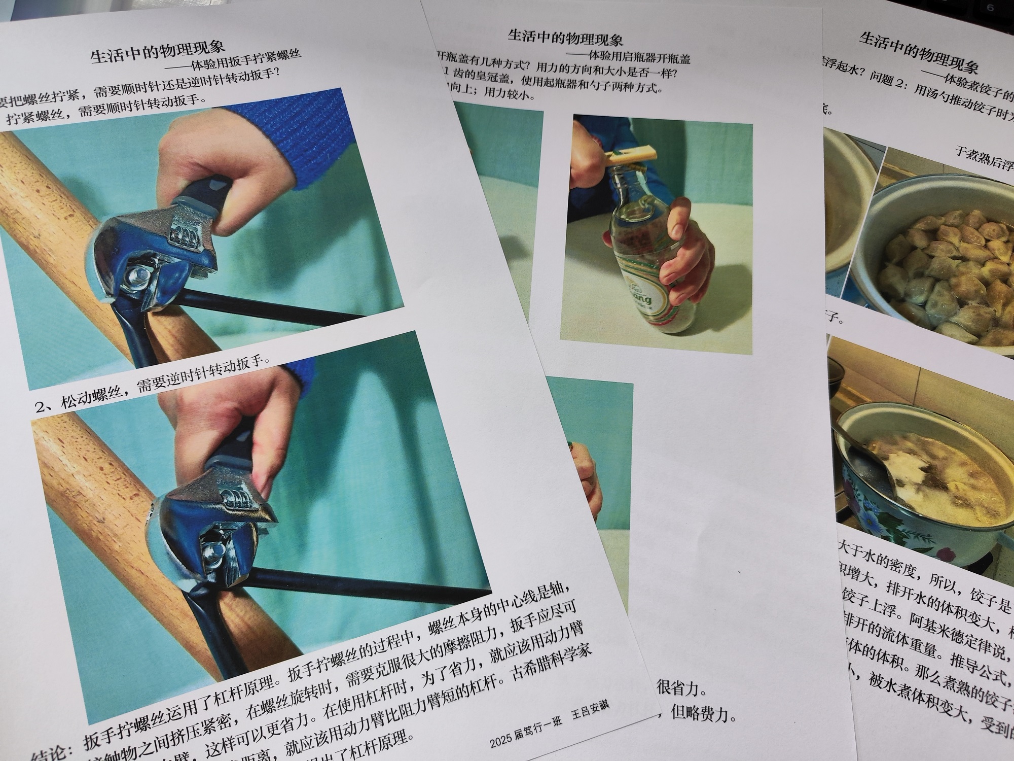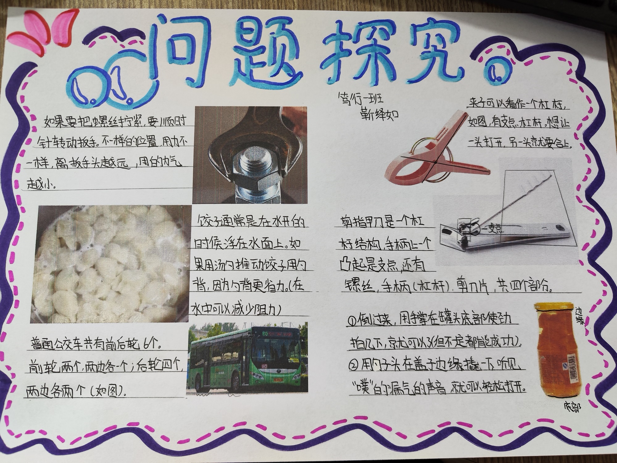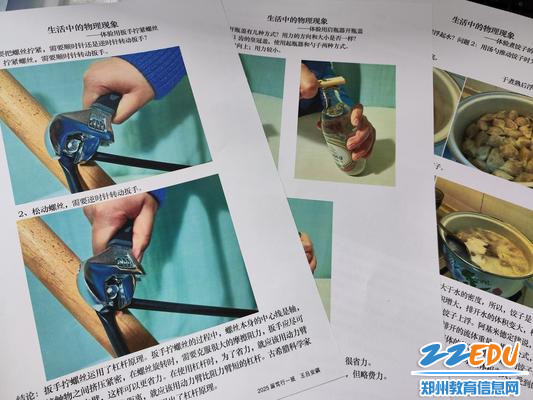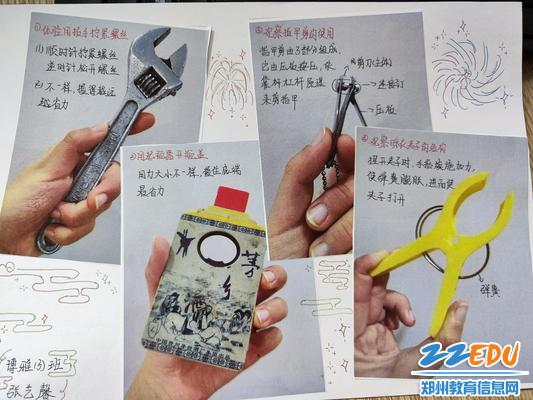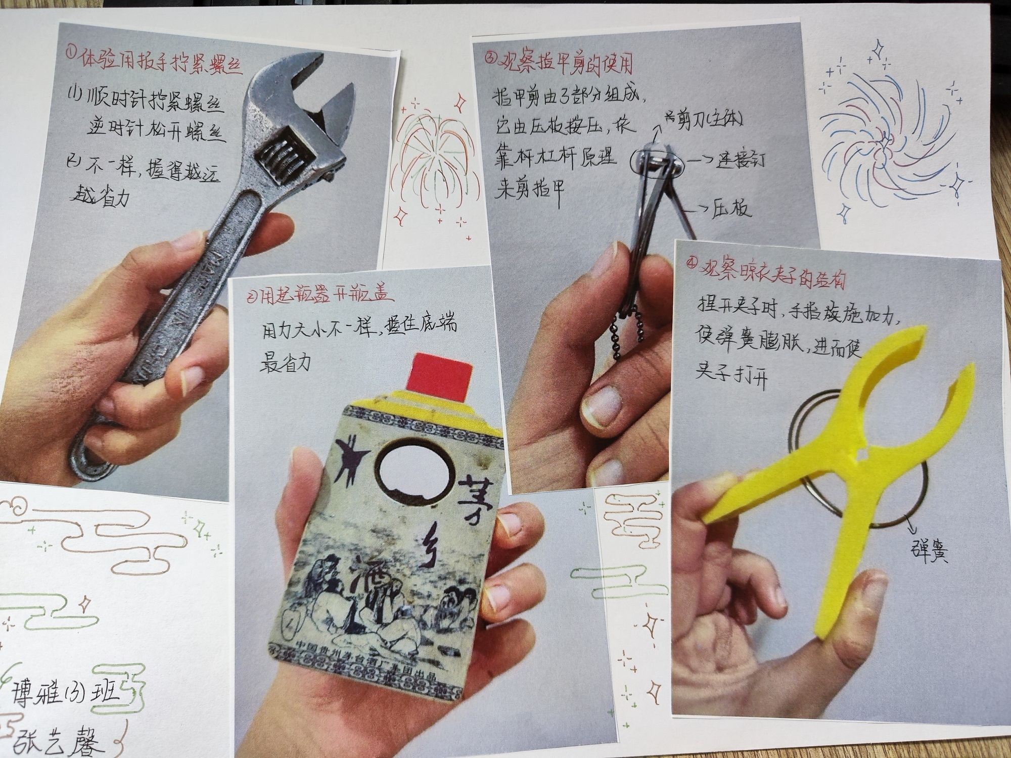 “起瓶器开瓶盖有几种方式?用力的方向和大小一样吗?”“手抓着扳手的不同位置拧螺丝你感觉用力一样大吗?”……面对这样新奇的动手体验类作业,学生们兴致勃勃,充分利用身边的资源进行体验探究。生活体验类作业拉近了物理与生活的距离,弥补了课内实验的不足,真正做到了“从生活走向物理,从物理走向社会”。