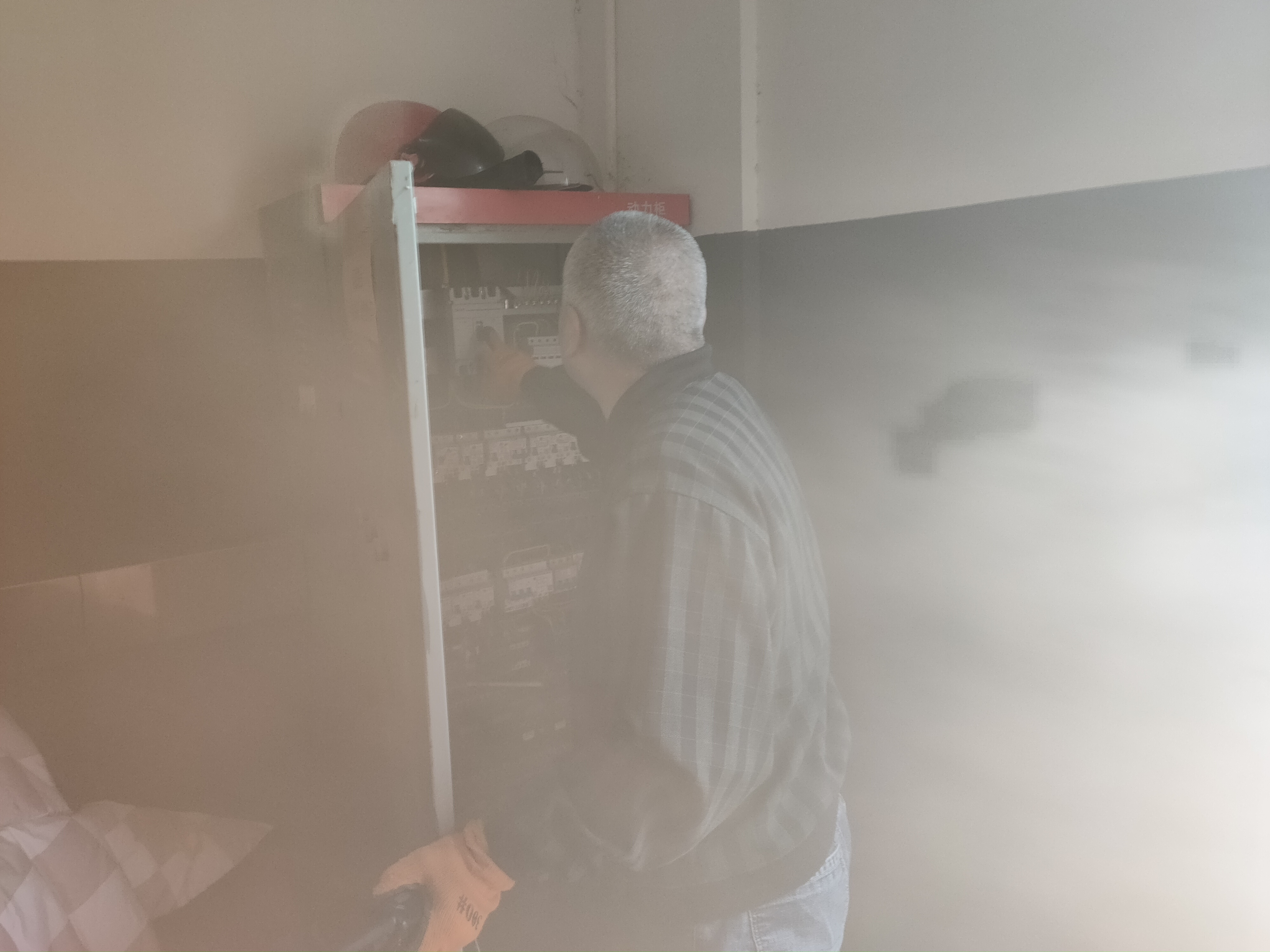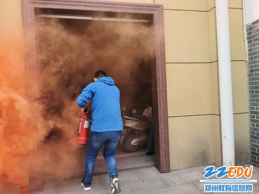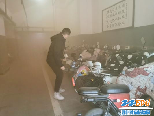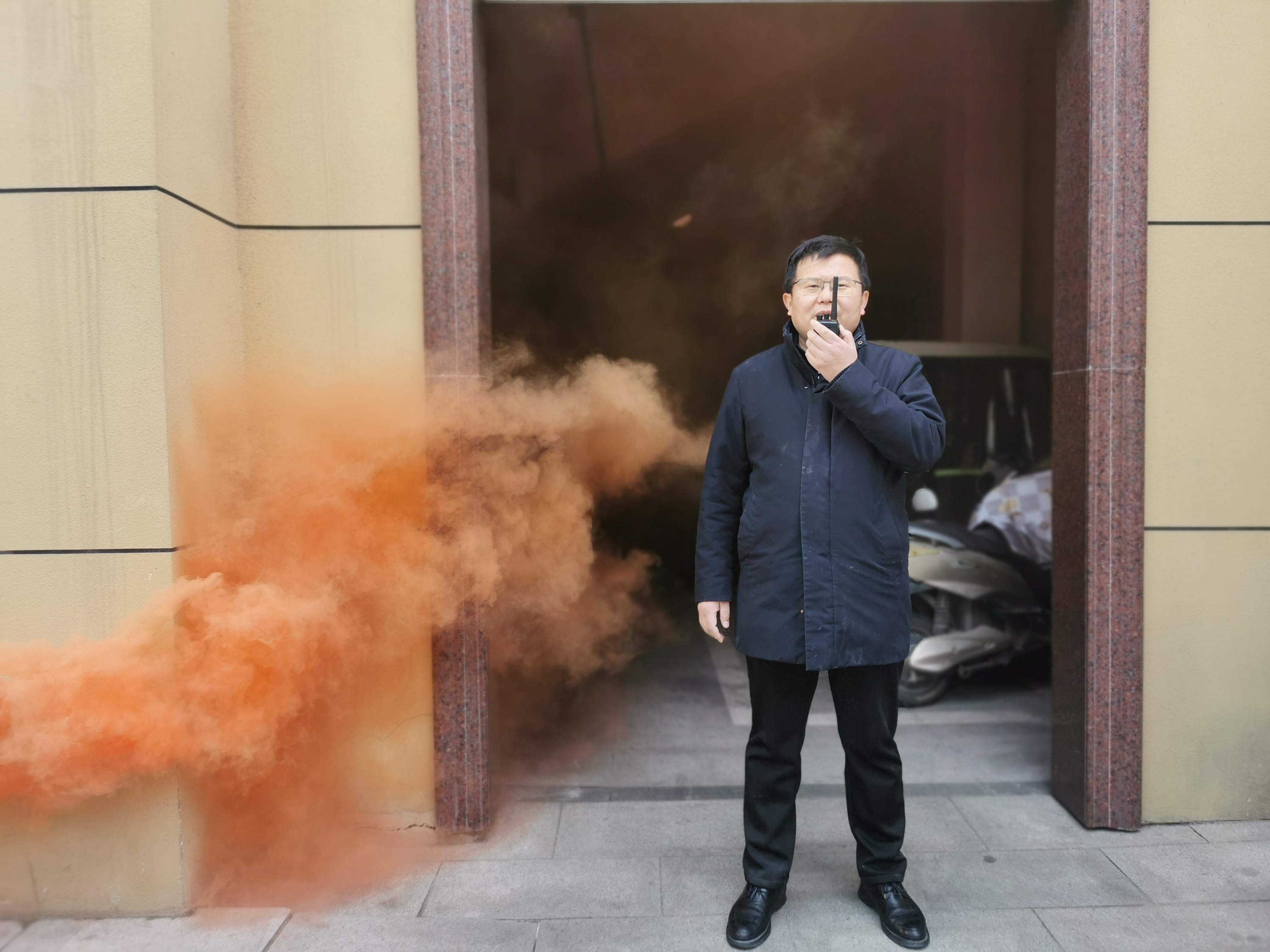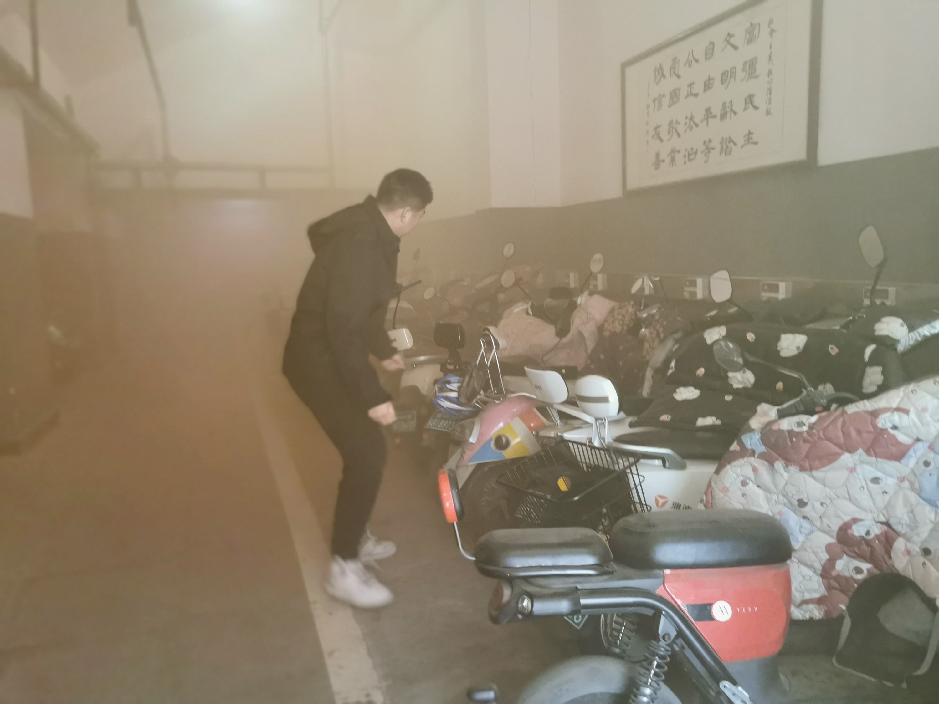 演练模拟电动车库内一辆电动车起火,火势突然发生并伴随浓烟。学校老师发现险情后,立即模拟拨打119报警并上报学校消防安全应急处置办公室,办公室各小组成员迅速行动,协同展开救援和处置工作,应急抢险组先对火灾险情评判,并对车库进行紧急断电处理,随后使用灭火器扑灭起火区域;应急联络组通过对讲机向学校各部门通报险情情况,维护校园秩序;善后处理组组织校医、总务处负责人准备好救灾物品,准备对现场进行后续处理。