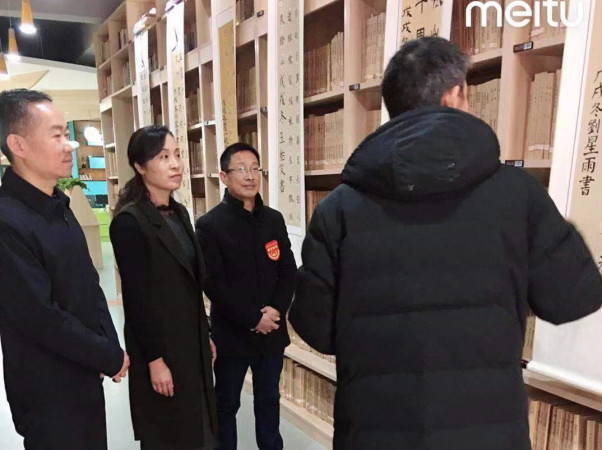 正心书法社团翟自永老师为校领导介绍展览情况