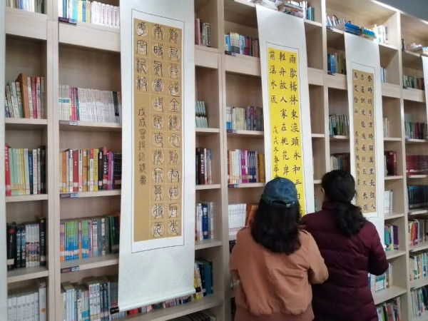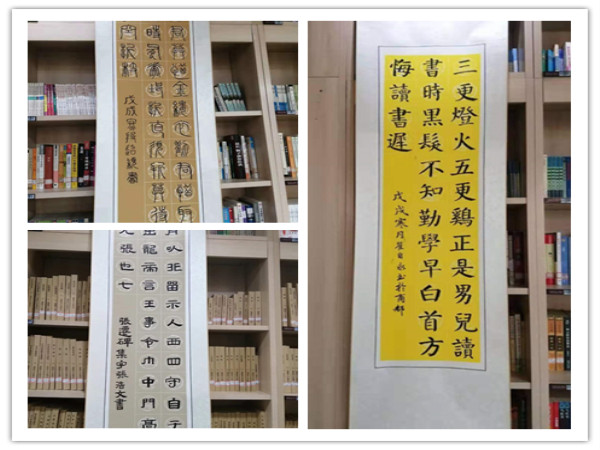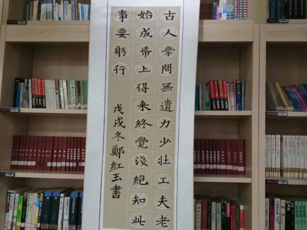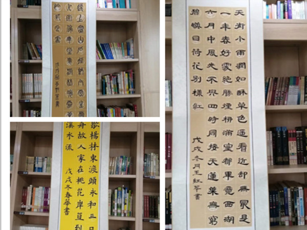 此次展览在校图书馆举办,参展作品部分为正心书法社团的学员创作,还有爱好书法的教师创作。退休教师郑红玉老师怀揣对书法艺术的热情,风雪无阻到国学教室坚持练习,已成效显著。段超颖、姚改芳、李艳丽、王红华、柳春华、赵巧玲、张蕾等老师,秉持对传统文化的热爱,业余时间潜心练字,也均取得了很大进步。这些参展作品字体齐全,风格多样。就传承名家方面看,有颜体、欧体、赵体;就临摹碑帖方面看,有《多宝塔》、《曹全碑》、《张迁碑》、《乙瑛碑》等;就美学风格方面看,或险峻挺拔,或端庄大气,或古拙纯朴,或厚重典雅,均能给人带来美的享受。