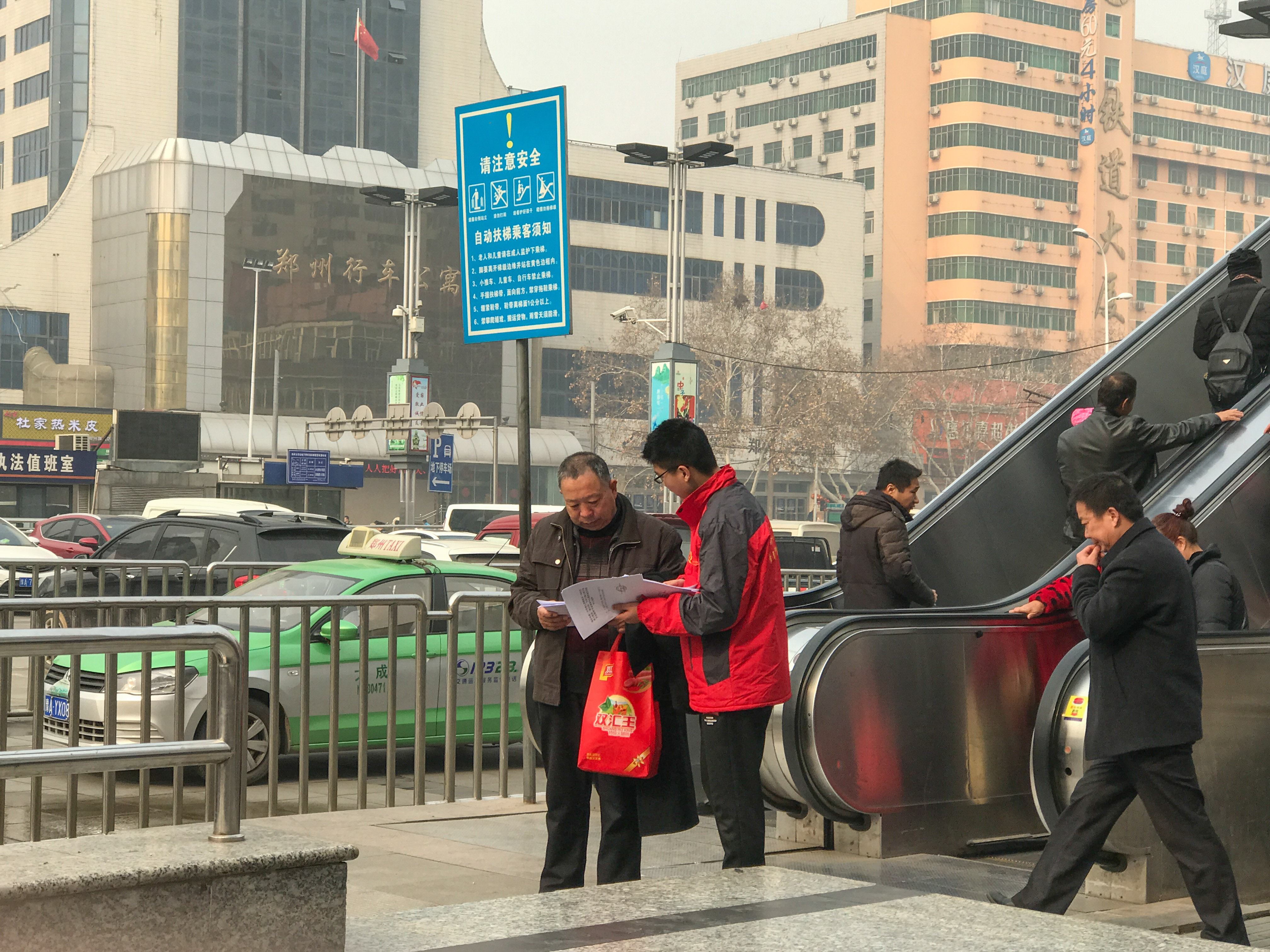 上午10时,志愿者们来到郑州火车站,与郑州火车站管委会文明办沟通之后,在郑州火车站东广场及售票大厅开展志愿服务,为广大旅客提供查询、引导、帮扶老弱提行李、指导乘车信息等,并向过往的旅客宣传发放“爱护市容 摒弃陋习”倡议书,倡议共同爱护市容、共建安全、整洁、有序、文明的城市环境,受到广大旅客的欢迎。