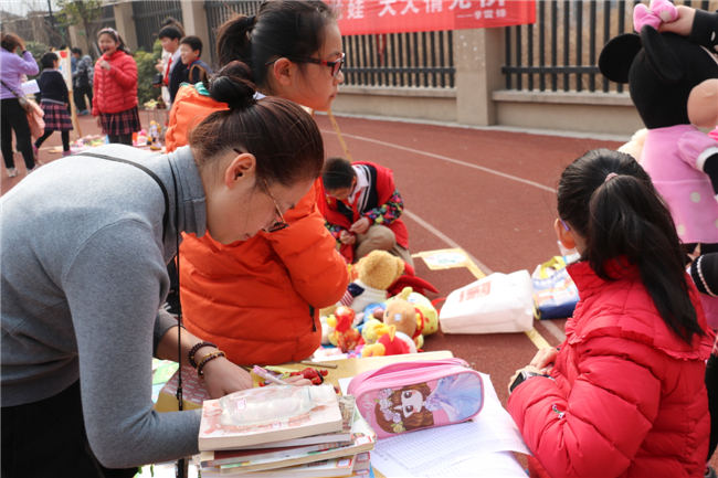 各班摊位上琳琅满目的摆满图书、文具、玩具、手工制作、精品等,学生们把捐献的物品进行分类、定价、编号并贴标签。每个摊位上设有有负责收款的收银员员、做记录的记录员、销售员、保安。为了维持市场秩序有各班大队委组成的12315消费者权益保护协会,还有老师们组成的市场执勤秩序员及学校领导的巡视,三层把控。使整个义卖市场热闹而有序。