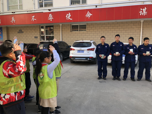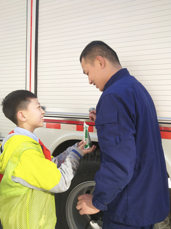 2019年3月22日,“小暖”们利用周五下午社团活动时间,开展“寻找我身边的雷锋”主题活动。在校园里,他们寻找到看见纸屑主动捡起的“环保雷锋”;看见水龙头滴水主动拧紧的“节能雷锋”;看见同学遇到困难主动上前帮忙的“爱心雷锋”……在校外,他们沿着黄河路一路寻找雷锋的身影,他们见到了辛勤劳动的环卫工人,看到了风吹日晒中辛苦执勤的警察叔叔,小暖们认为这些为城市默默付出的人就是他们心目中的当代雷锋。“小暖”们用平日义卖时积攒下来得公益基金,购买了酸奶、矿泉水,制作了感恩卡片,向这些当代雷锋致敬。最后一站,“小暖”们来到了郑州市消防支队金水区大队经五路中队。正巧,出勤归来的消防员叔叔刚好下车,“小暖”们纷纷上前向“英雄们”致敬。消防员叔叔热情的带领“小暖”们参观了消防车,向同学们介绍了消防车辆和一些随车器材装备,还向他们讲授火灾预防常识及发生火灾时的注意事项等消防安全知识,并对如何报警、自救、逃生进行了详细的讲解,消防员叔叔还打开车上的一扇扇小门,用浅显的语言给大家介绍了许多消防车上的小秘密:消防器械、高压水枪、防毒面罩、氧气瓶、急救箱等消防装备。