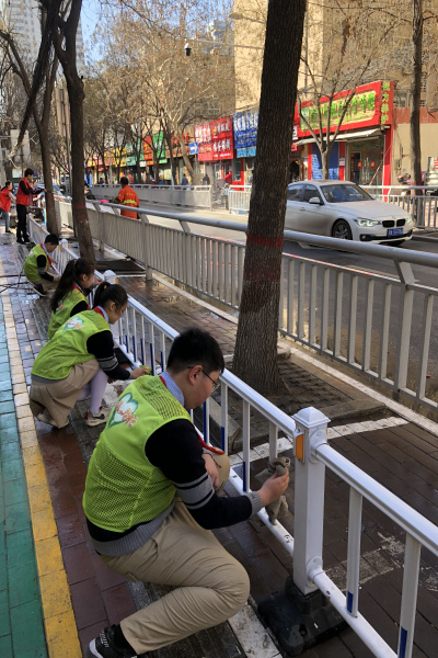 “小路长”们拿着抹布认真擦拭人行道内侧的护栏