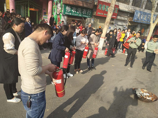 讲座结束后,全园师生进行了火灾逃生疏散演练,周教官对演练情况做了点评,现场讲解了火灾逃生中的注意事项,演示了灭火器的正确使用方法。最后,部分教师和家长进行了灭火器的实际操作演练。