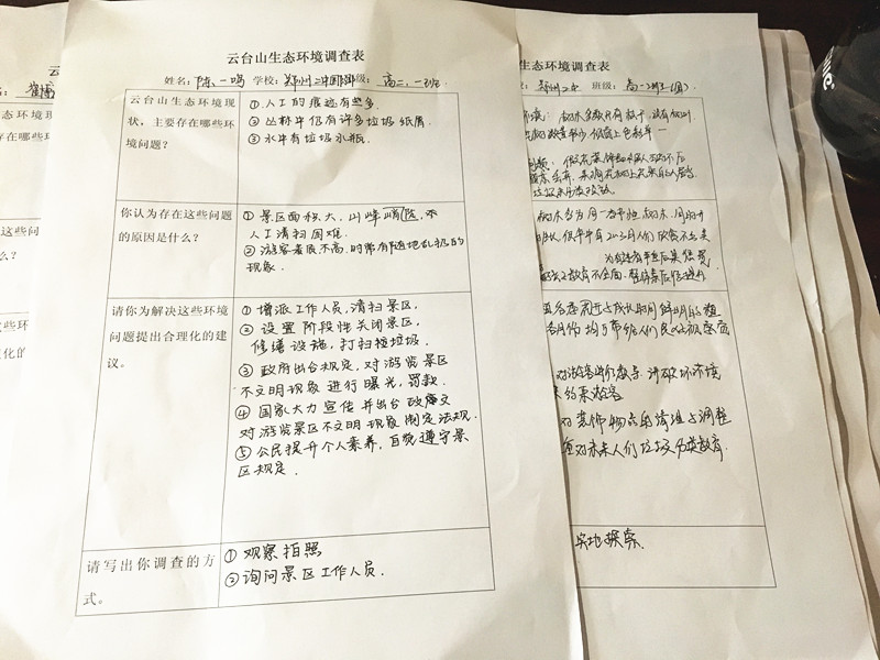 此次社会实践活动以“提高学生的综合实践能力”和“爱护环境”为主题。3月28日,全体师生赴云台山研学,分组进行生态环境调查。同学们走进大自然,清扫垃圾,提醒并制止不文明行为,观察、记录人们爬山踏春时优良及不良行为,向游客们发出了50余份关于环境保护的问卷调查,并与爬山的游客们进行了环保知识的问答互动。