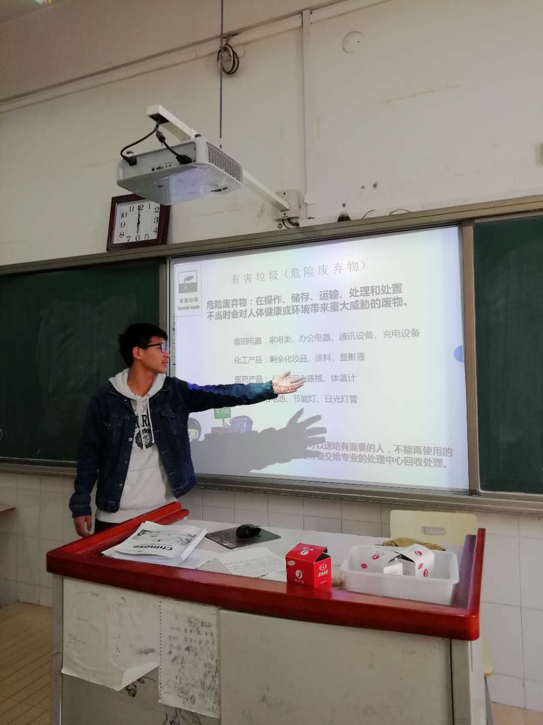 3月27日的“学生讲堂上”,唐钰超同学从“我们每个人每天制造的垃圾有多少?”“每天世界上会产生多少垃圾?”等问题入手,然后以精确的数字展示给大家,结果让所有学生瞠目结舌。接着他又向大家讲了几则震撼人心的新闻,分析了垃圾给人类生活带来的种种危害,并呼吁人们减少垃圾排放,变废为宝,保护环境,建设绿色中原。