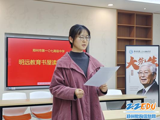 刘紫涵老师以《春芽破土时,静听教育拔节声》为题,围绕教育现代化、教育教学本质以及自身政治课教学实际,谈到了《热风集:顾明远教育沉思》对自身教学工作的影响。