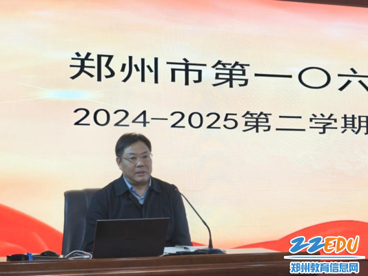 郑州市第一〇六高级中学校长胡庆周作总结讲话。他指出,在各教研组长的带领下,各学科教师积极投身于新课程改革和课堂变革与实践,取得了显著的成绩,特别是在课题研究、论文发表、省市优质课评选、青年教师培养等方面屡获佳绩,充分展示了学校教师的教学水平和研究能力。同时,他也指出了当前教学中存在的一些问题,如部分教师对新课程标准理解不够深入、教学方法创新不足、教学效率不高等。最后,胡庆周对新学期教研工作提出了期望,他强调,教研工作是提升教学质量的关键,此前各组已经通过教研活动、集体备课、“三新”教学探索与研究、做题研题、课题研究等方面不断尝试,促进了教师与学生共同成长,这些有效的措施要继续发扬。本学期各教研组要牢固树立“教科研兴校强校”意识,以高度的责任感和使命感,积极投身到新课程改革和教学研究中去,不断探索教育教学规律,创新教育教学方法,努力提升自身专业素养和教育教学水平,为学校高位特色快速发展贡献力量。