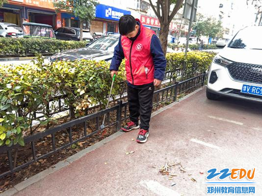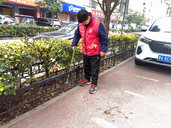 学生夹取社区绿化带烟头