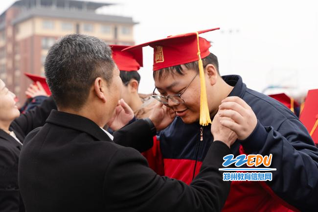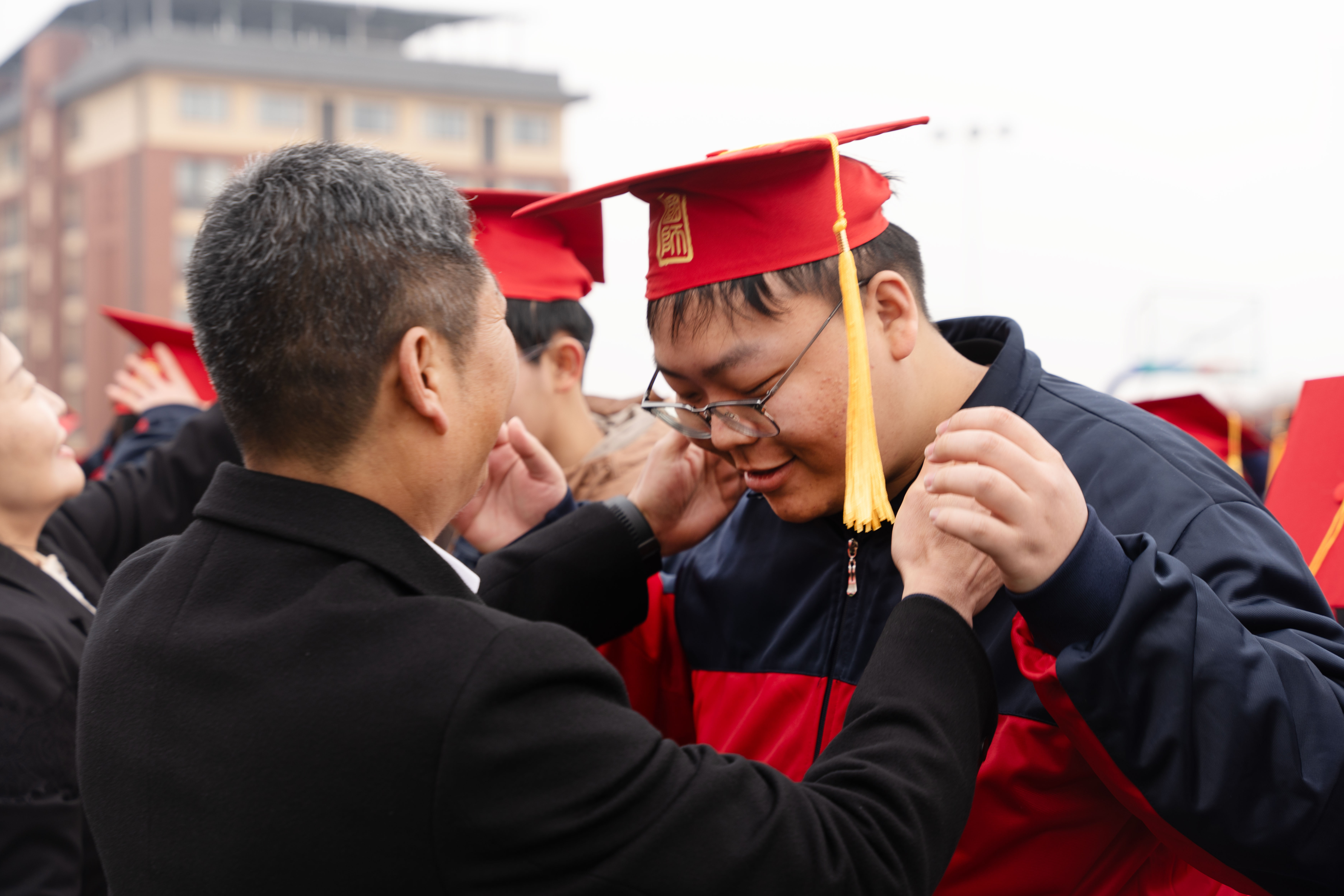 当《离别开出花》的动人旋律渐息,全体学子右拳紧握,在马英浩同学的领誓下许下热血沸腾的青春誓言。校领导为学子拨穗正冠,金色流苏自右而左的瞬间,象征稚气褪去、责任加身。学生代表刘飞帆轻抚冠冕感慨:“穗摆移动不过数寸,却让我真切感受到成长的分量。”
