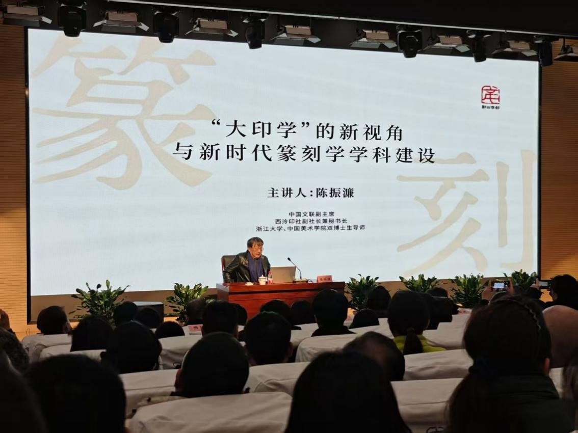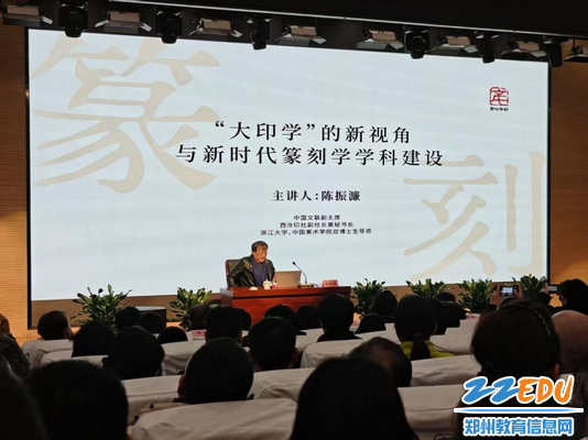 参观过程中,郑州市第二十四中学的学生被展出的中外印章艺术深深吸引。他们仔细观赏着每一件精美的展品,认真聆听郑州市第二十四中学教师夏晓东的详细介绍,不时驻足交流心得与感悟。现场,他们还认真聆听了中国文联副主席、西泠印社副社长兼秘书长陈振濂带来的专题讲座。陈振濂对本次展览进行了深入浅出的解读。他提出,此次展览不仅是对“守正创新”精神的一次重要实践探索,更是对“和而不同”这一深刻文化理念的生动诠释与弘扬。他热切期望,通过这次展览,能够进一步增进世界各国人民对彼此文化的理解和尊重,携手共促人类文明的繁荣与发展。