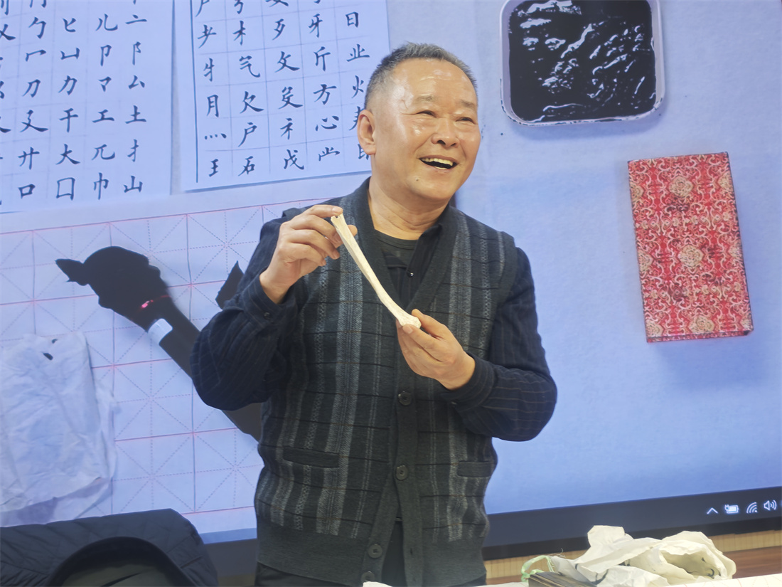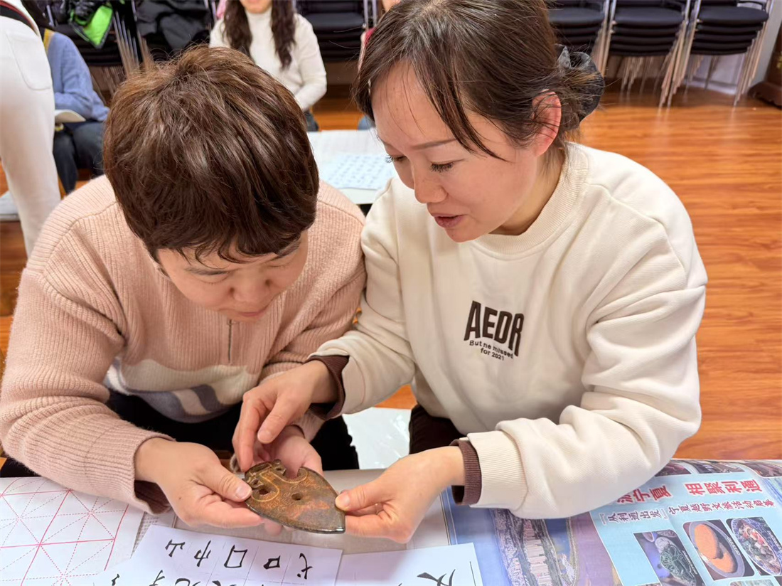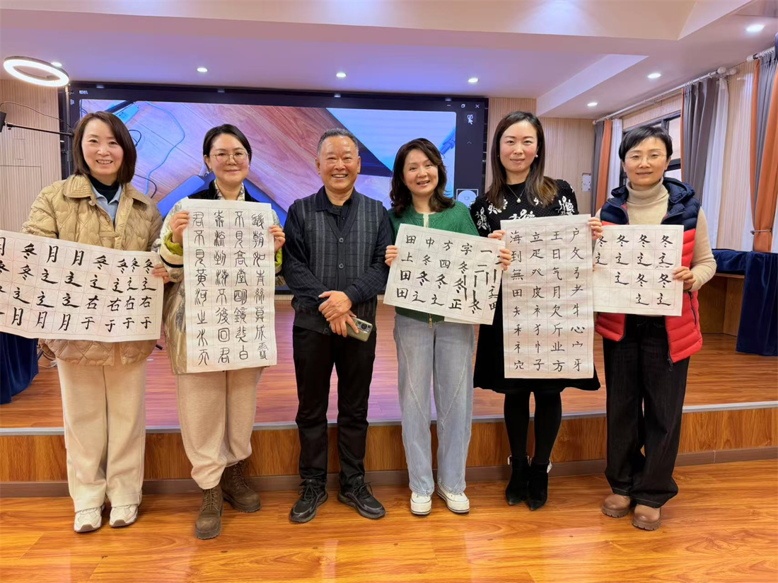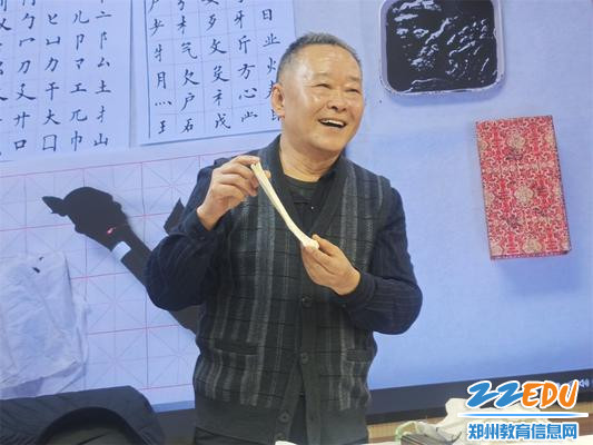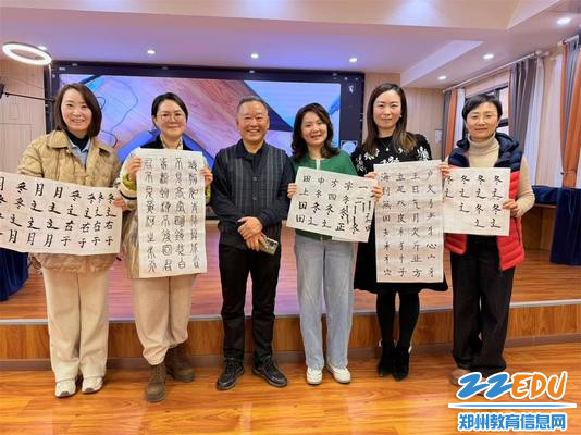 在教职工们热烈的掌声中,河南省书法协会会员王文达老师闪亮登场。王文达化身“文化使者”,用生动有趣的语言,带着大家穿越历史,探寻书法的发展脉络。从古老的甲骨文演变历史,到书法流派的书写特点,他通过细致的讲解结合亲自演示,让大家真切感受到书法的独特韵味。