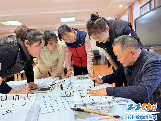 实践练习环节,王文达穿梭在教职工中间,目光如炬,时刻关注着每个人的书写状态,细心解答教职工在书写练习时遇到的问题,耐心地手把手纠正握笔姿势,细致地讲解书写手法,一笔一划,尽显专注。
