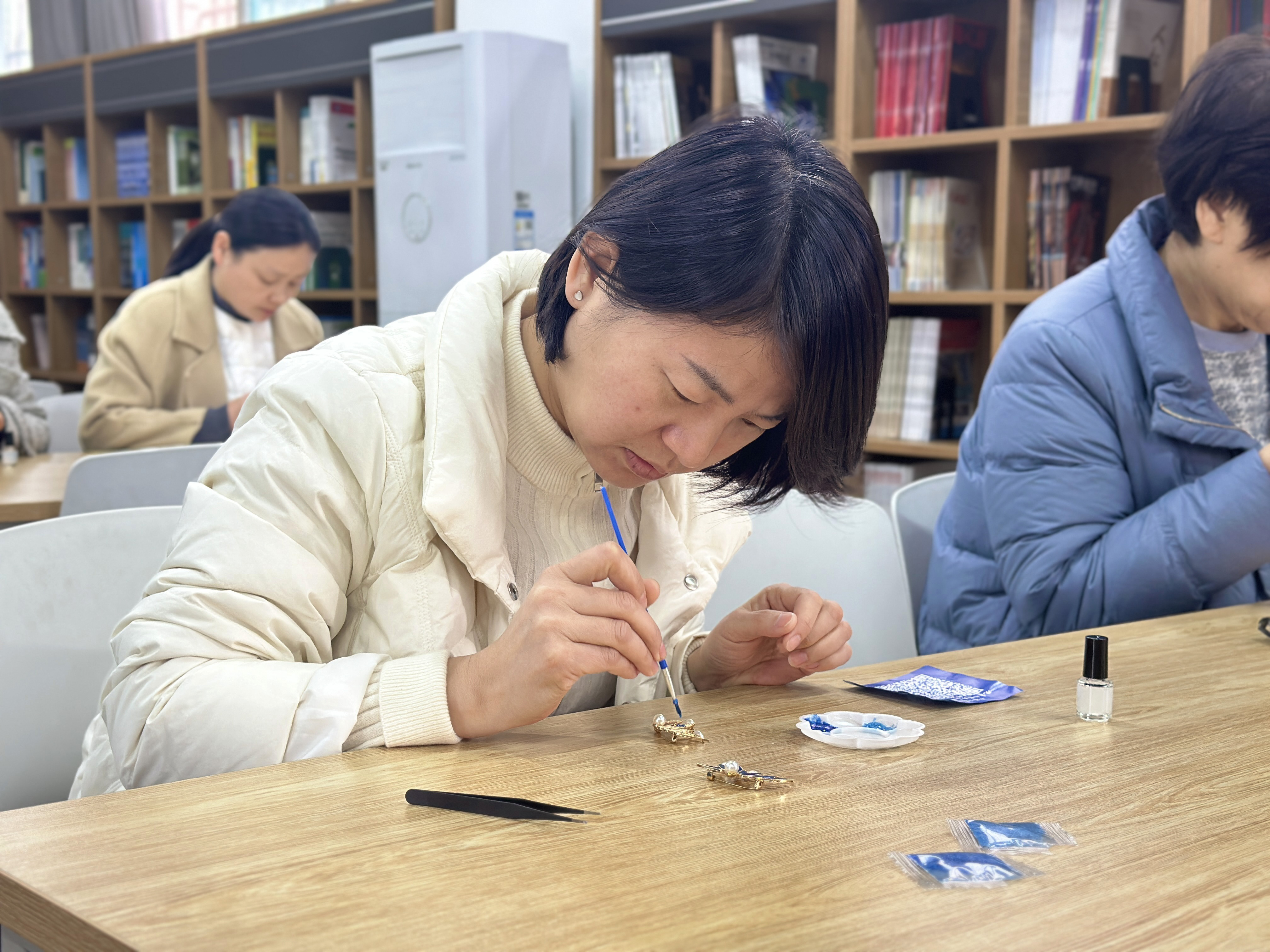 在图书馆中,学校工会主席李伟红向大家介绍了螺钿胸针的历史渊源及制作方法,老师们一同在创作中感受传统非遗文化的深厚底蕴,活动现场气氛轻松愉快、温馨热烈。参与教师表示,工会安排传统手工艺活动颇具深意,不仅丰富职工们的也课余生活,更让大家在繁忙的工作之余放松身心。