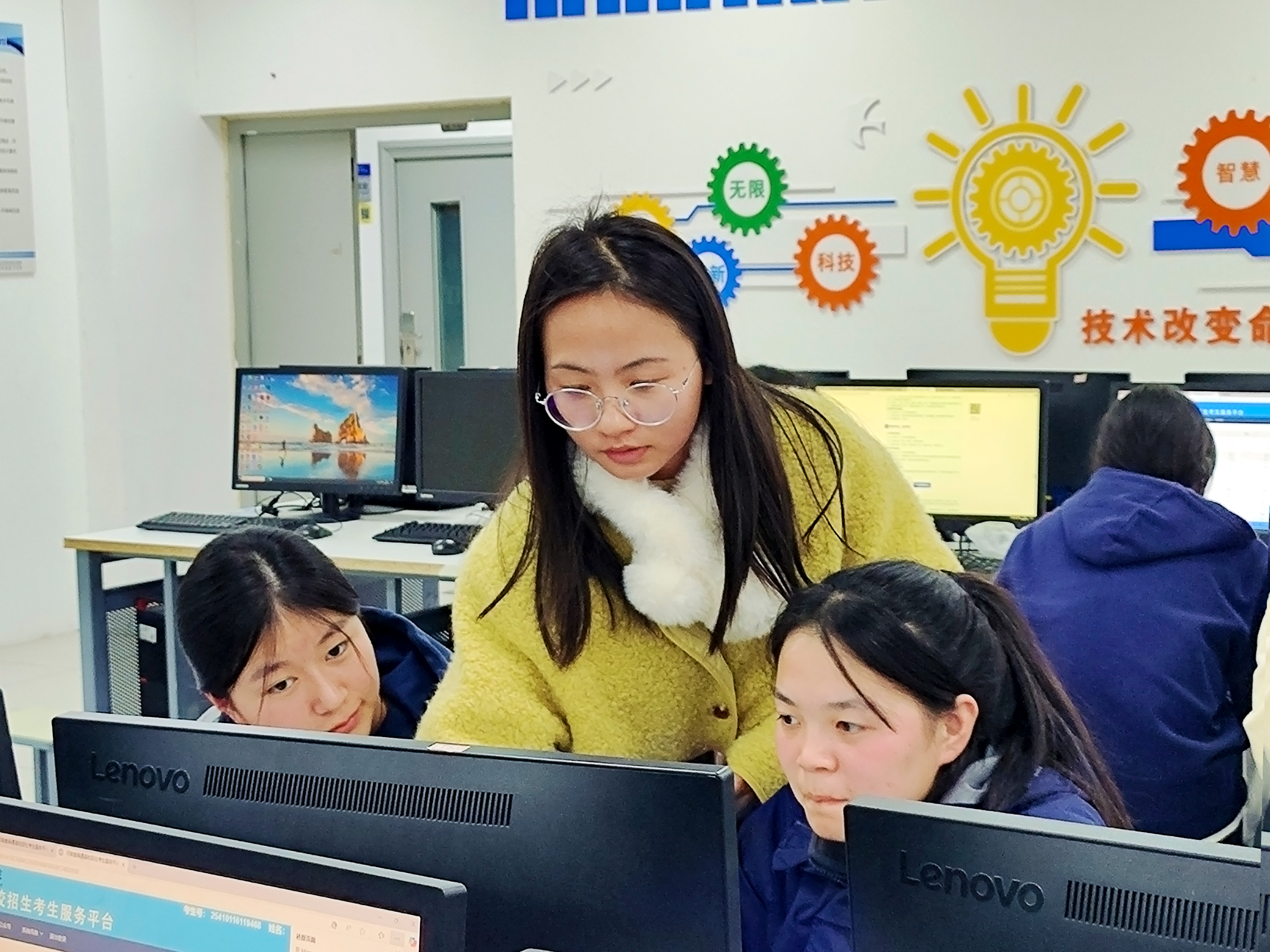 模拟志愿填报现场,学校副校长张继波到场指导,仔细询问学生的志愿填报意向和面临的困惑,为学生答疑解惑,鼓励学生理性思考,做出最合适的选择。高三班主任恪尽职守,成为学生志愿填报工作的重要指导力量。他们对学生的个性特征与学业表现深入了解,在一对一沟通中,基于学生实际情况,为其提供详尽且精准的指导建议。从专业选择到院校梯度设置,班主任们一一给出针对性的建议,帮助学生结合自身兴趣、特长以及未来职业规划,合理规划志愿填报方案。经过系统培训的班干部们秉持高度负责的态度,在各自所负责的机房内有条不紊地对同学们进行报考流程的指导。学校教务处陈玉秀全程深度参与到各班级的志愿填报指导工作中,穿梭于机房的各个角落,时刻关注学生们的疑问。