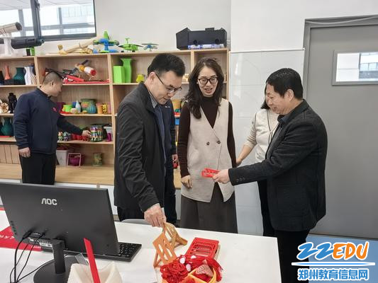 党委书记贾洪波向调研组组员介绍学校创意手工课程成果现场