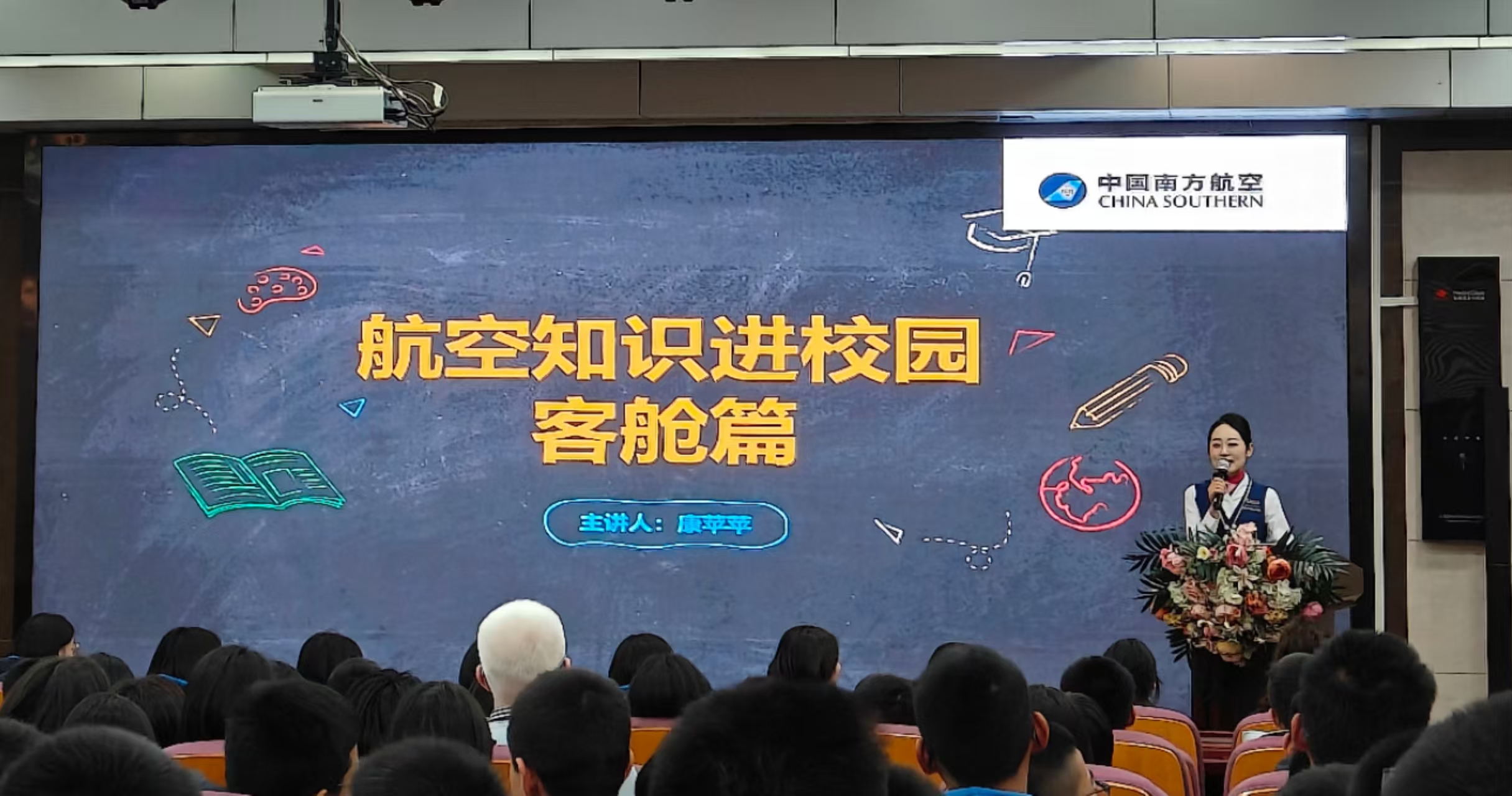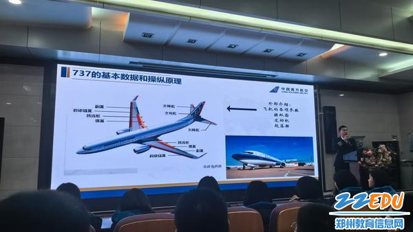 活动伊始,学校报告厅座无虚席,学生们满怀期待地迎接这场航空科普盛宴。活动特邀中国南方航空河南分公司市场营销部、飞行部 、维修工程部、客舱部志愿者为同学们带来了一场生动精彩的科普讲座。青年志愿者们通过PPT和视频、现场互动、有奖竞猜等形式,深入浅出地向学生们普及飞机的起源、飞机的构造、飞机型号、飞行原理、飞机维修、飞机检测、安全乘机等基础知识,极大地激发了青少年对航空文化的浓厚兴趣。