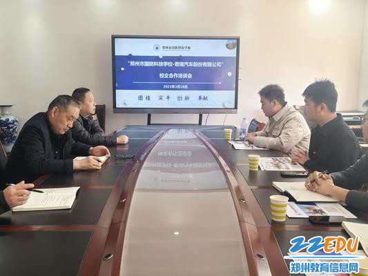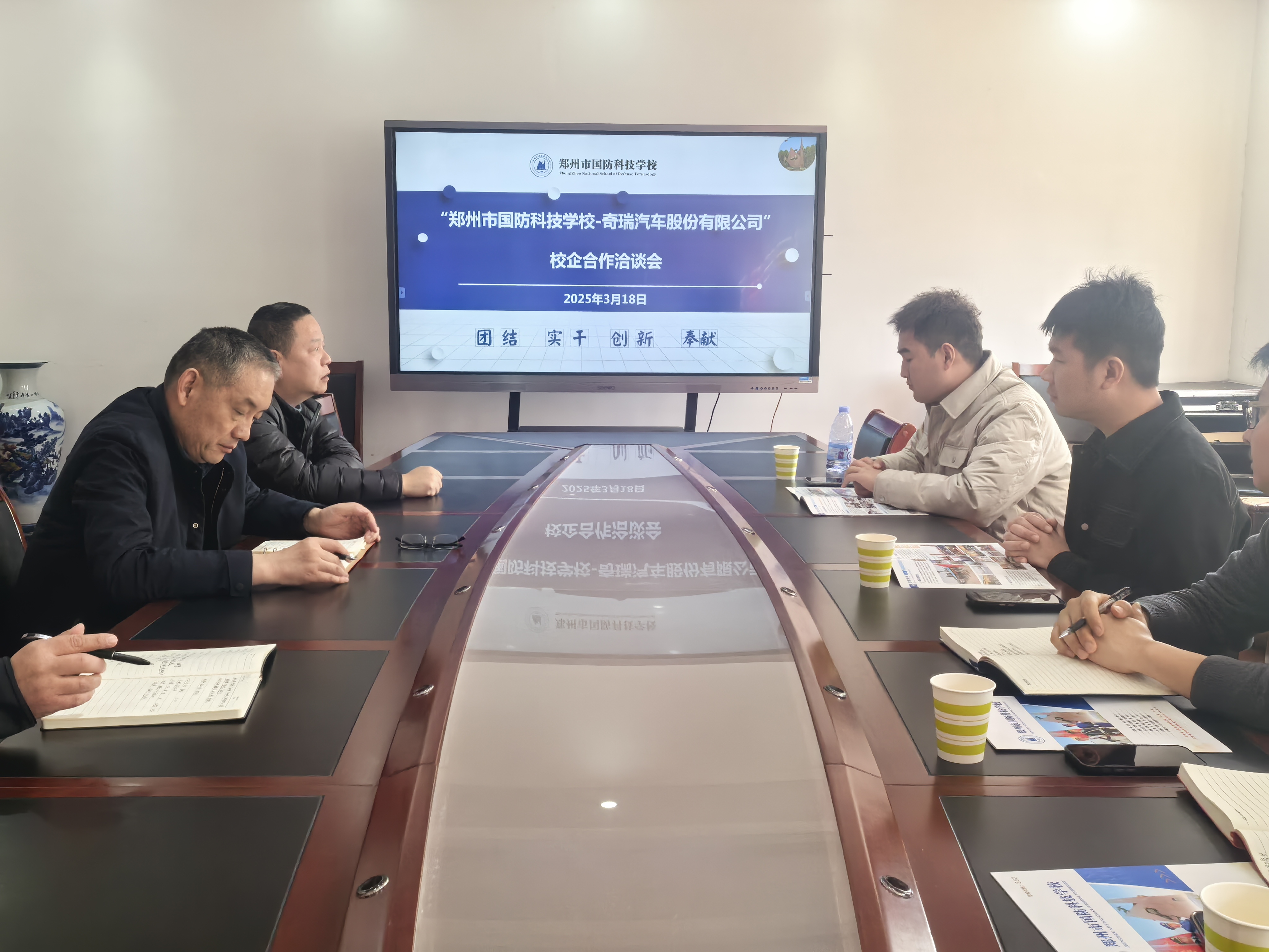 为进一步推进职业教育与产业发展的深度融合,培养高素质技术技能人才,2025年3月18日,郑州市国防科技学校与奇瑞汽车股份有限公司校企合作交流会在学校会议室举行。奇瑞汽车股份有限公司人力资源部科长杜文凯、校企合作招聘经理张正武,郑州市国防科技学校副校长黄江元、招生就业处主任杨建松参会,双方围绕汽车产业人才培养、产教融合机制创新等议题展开深入交流。
