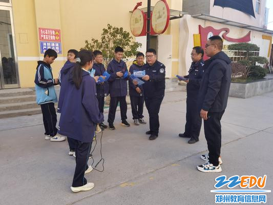 民警在郑州经开九龙中学发放郑州市公安局经开分局致人民群众的一封信