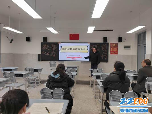 郑州市扶轮外国语高级中学政教处副主任钟明磊主持召开疏散逃生演练活动筹备会