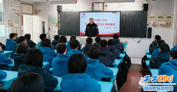 为进一步增强郑州八中学子的法治观念,引导他们知法守法,护航安全健康成长,3月21日,郑州八中邀请学校法治副校长、郑州市公安局金水分局经八路派出所副所长岳修辉为学生们带来了一堂法治教育思政课。岳修辉从《中华人民共和国未成年人保护法》《预防未成年人犯罪法》两部法律法规入手,讲解了青少年应如何遵纪守法以及利用法律武器保护自身安全。