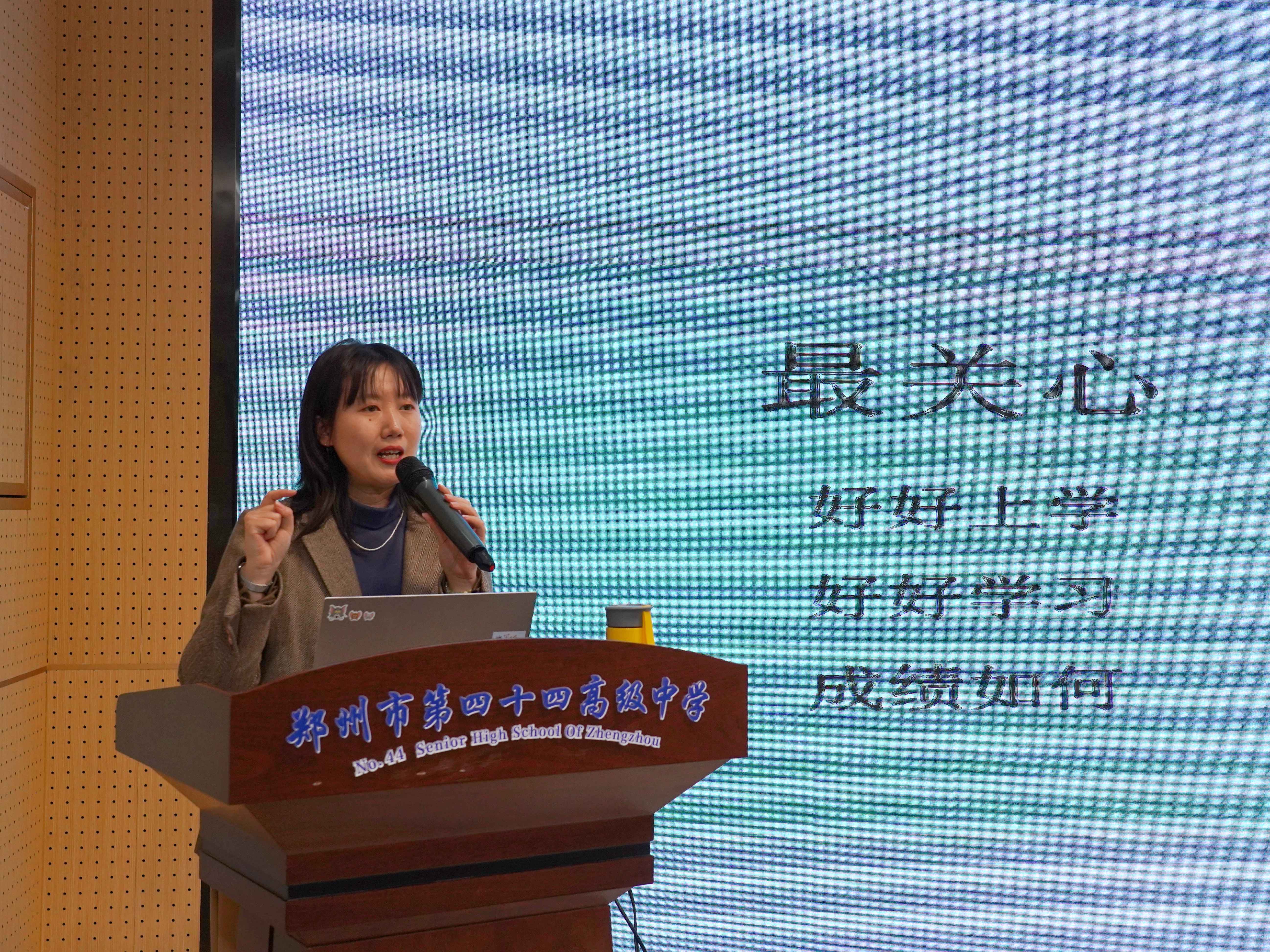 3月20日下午,学校特别邀请国家二级心理咨询师、郑州市教育局关工委心理专家团成员、郑州市妇联心理援助专家、大午心理首席心理讲师王雨青以“拒绝简单标签,拥抱柔性智慧”为核心,将心理学专业工具与生活化沟通符号深度融合,为全体正副班主任带来一场名为《学生心理工作:问题识别与回应——尽力所能及的努力》的专题讲座,讲座由郑州市第四十四高级中学工会主席杨海艳主持。