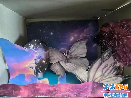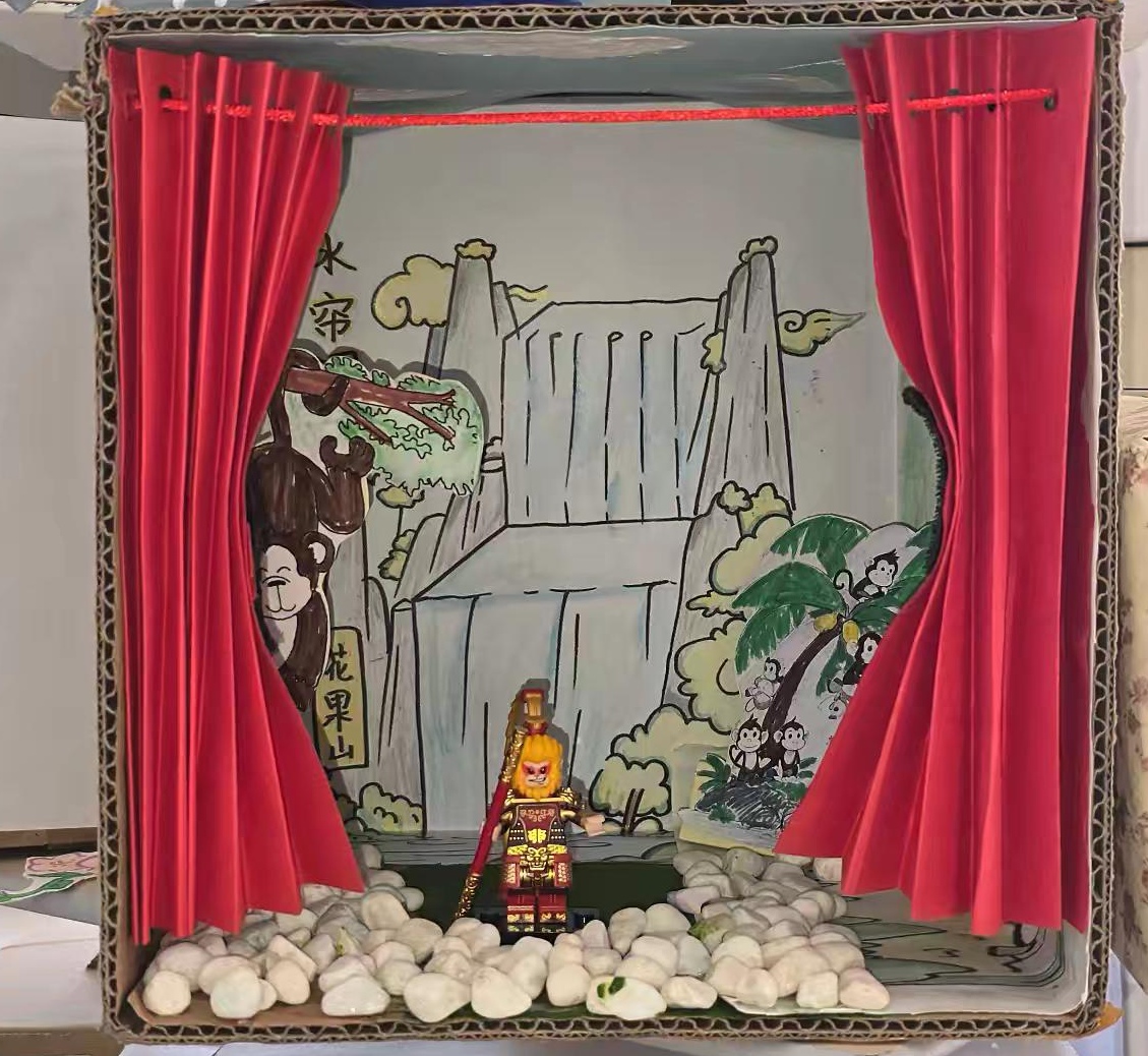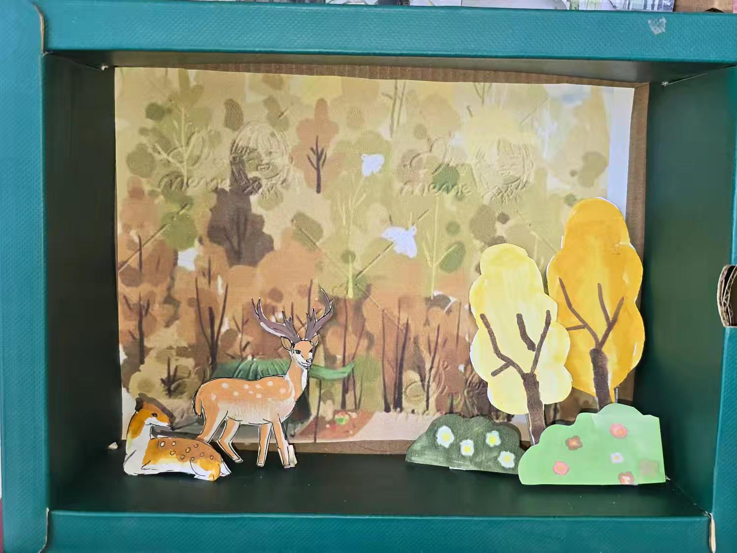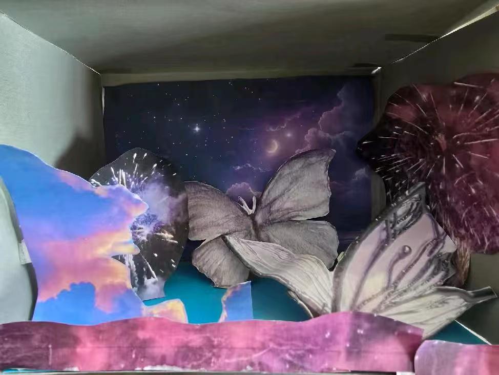 在春日课程中,学生把天马行空的舞台搭建了出来,实现了他们在最敢想时的想法,留下了他们年少时一笔宝贵的财富。这里有文学与艺术的跨界碰撞:舞台布景成为与文学沟通的窗口,我们从纸箱装置中穿越到了吴承恩笔下的水帘洞,这里的每一处细节都诉说着孩子们对于《西游记》的理解与想象;有自然之美与童心之趣:森林深处,两只小鹿悠然自得地漫步,它们的身影与周围的树木融为一体,展现出人与自然和谐共处的美好景象;有生活哲思与情感表达:一条穿过繁花似锦的小径,引领我们走向一个充满希望与梦想的地方——玫瑰走廊,它不仅是视觉上的享受,更是一种心灵的慰藉;还有梦幻与现实的交织:深邃的夜空中,一只巨大的蝴蝶翩翩起舞,周围点缀着星辰与白云,仿佛带领我们进入一个神秘莫测的梦境。