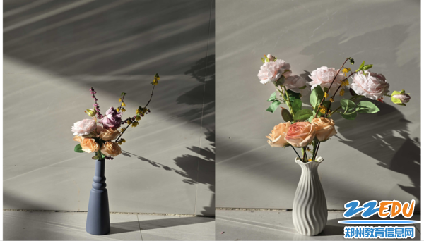 在春日的课堂里,美术学科组教师史啸威为大家展示了各具特色的插花作品,请学生在欣赏中感知中式插花色彩淡雅、普遍采用均衡的形式;西式插花用花数量多,有花叶繁盛之感,色彩艳丽浓重,创造出热烈的气氛,通常采用对称的形式。