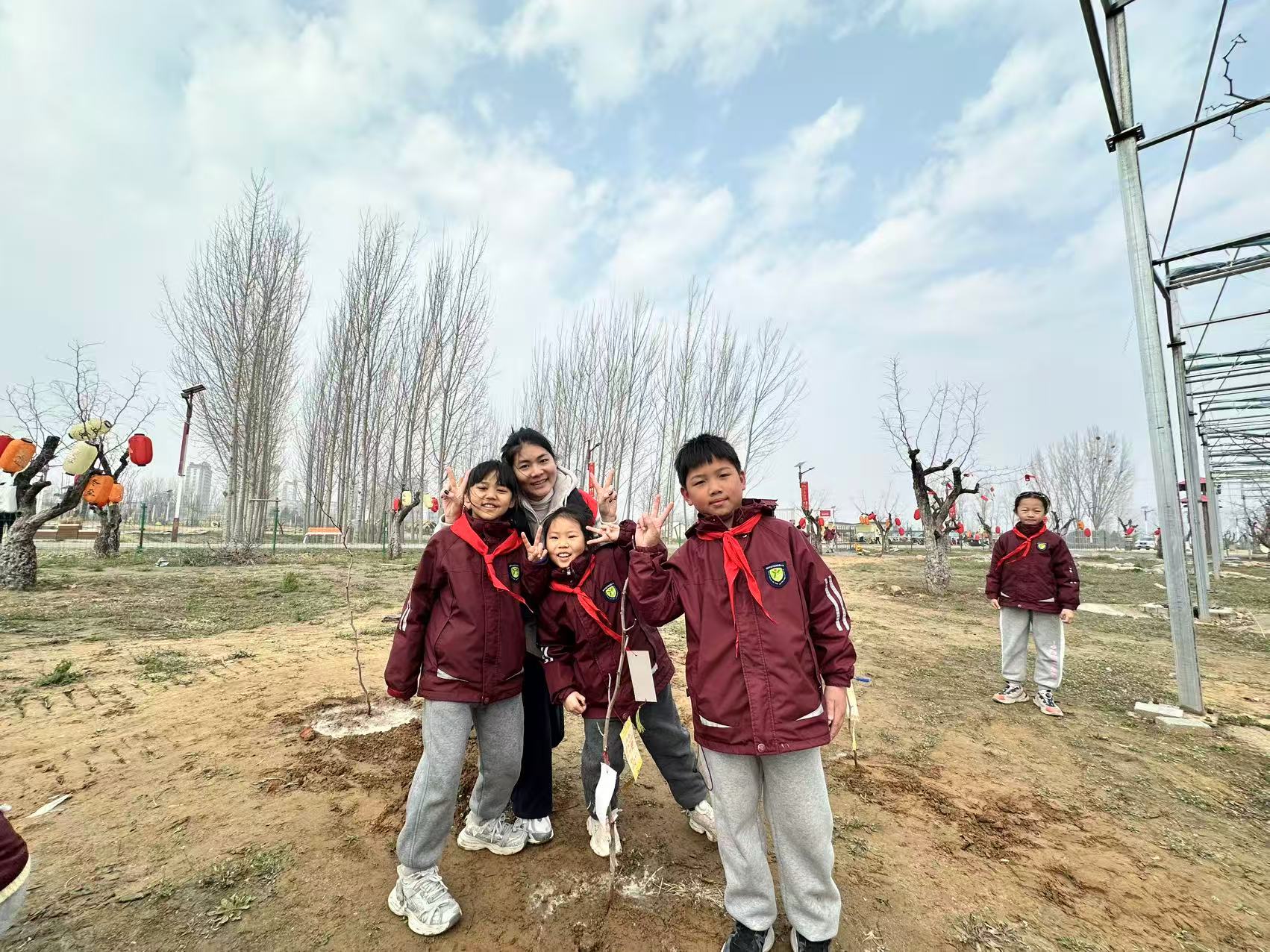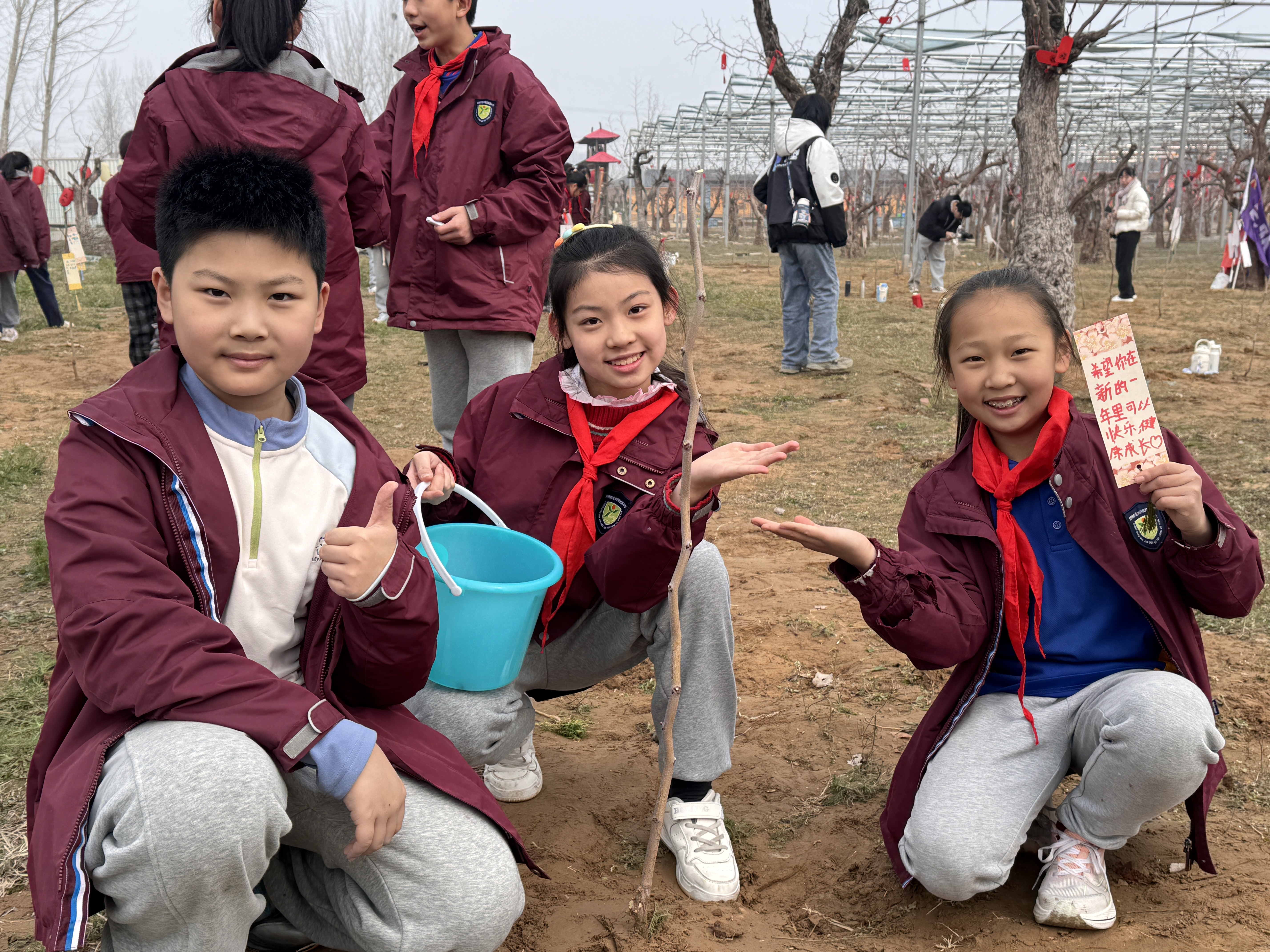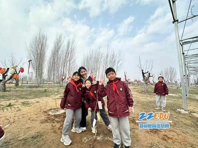 2026年3月10日,在老师们的带领下,金水区优胜路小学少先队员们来到郊外,开展植树活动。队员们以小组为单位投入劳作,跟着老师们一起,从挥锹挖坑、扶正树苗,到填土夯实、提桶浇水,师生默契配合,每道工序都凝聚着对绿色的守护。队员们还精心设计了个性化的树牌,将环保承诺与成长心愿镌刻在枝头,并融入劳动的每一个细节。