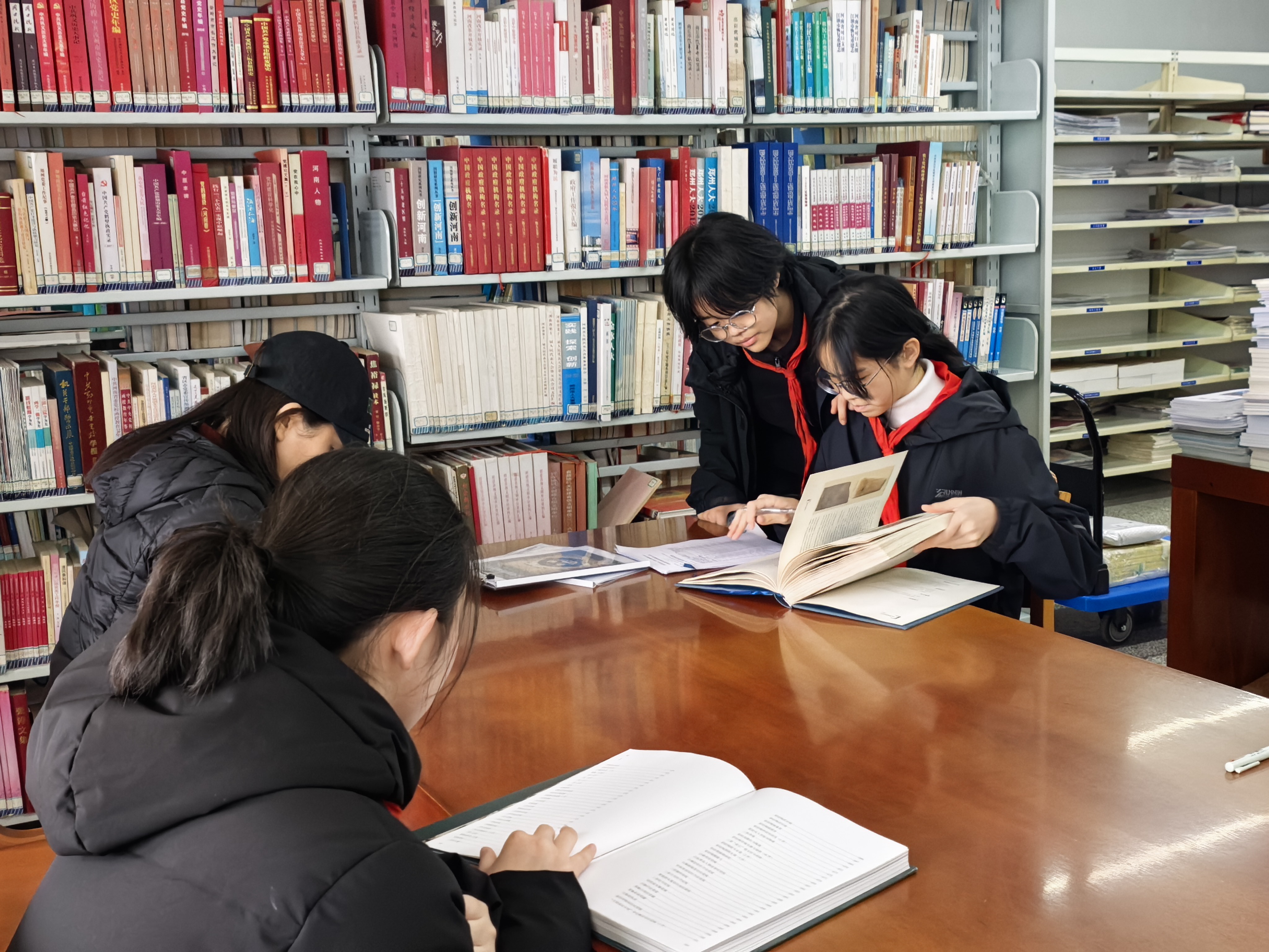 据悉,郑州八中《双馆奇兵》探究实践活动,是一项通过“博物馆实地探究+图书馆文献求证”的“河南文物探源行动”,旨在通过双馆联动的模式,引导青少年追溯中原文明根脉。此前的两期活动,同学们已经分组成立了“文物传承工作室”,并已走进博物馆确定了各组需要研究的文物及产生的疑问。在第三期活动中,同学们走进河南省图书馆,带着问题,开启了一场寻证书海的深度探究之旅。
