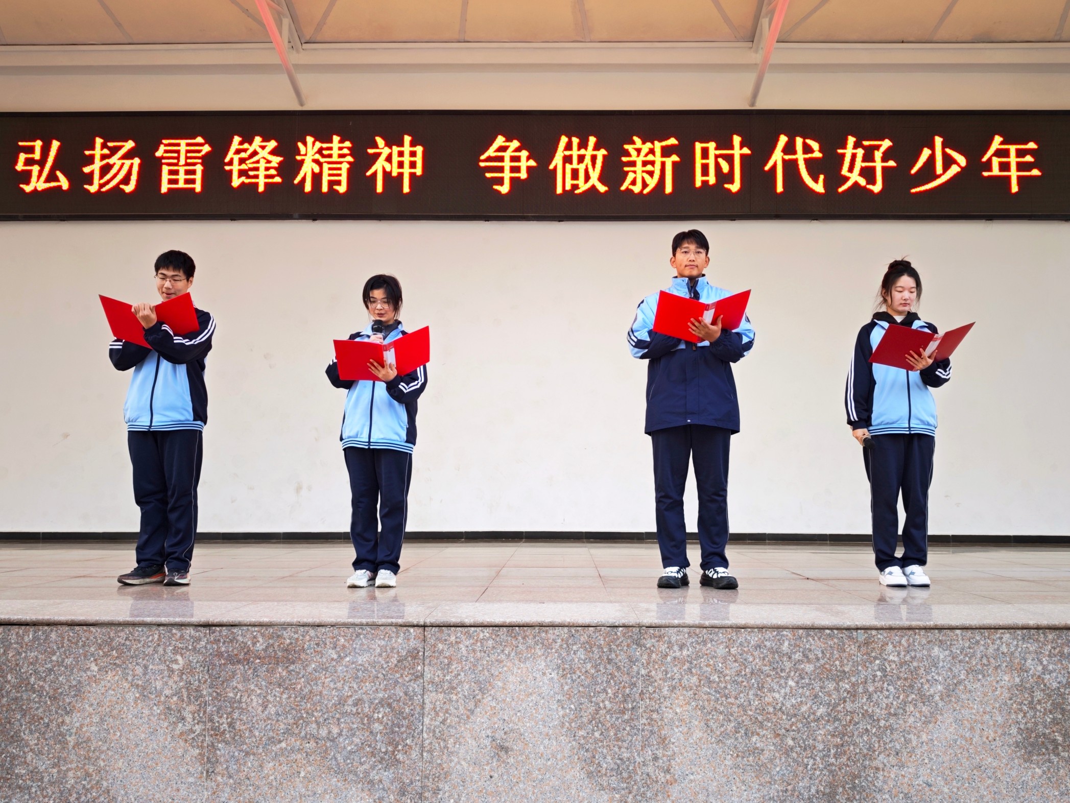 学生代表许钰堃、胡朗铭、高誉轩、王子宣登台朗诵诗歌《薪火相传 雷锋永恒》