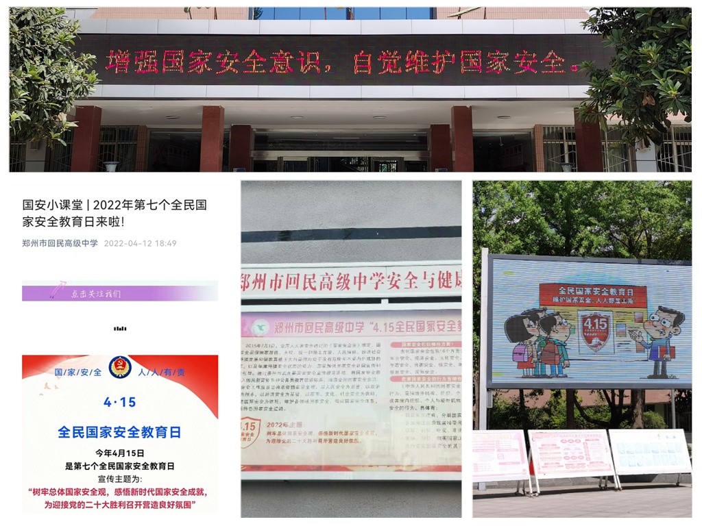 郑州市回民高级中学利用校园电子屏、LED横屏、校园安全教育展板等形式进行宣传教育,营造了迎接“全民国家安全教育日”的氛围。