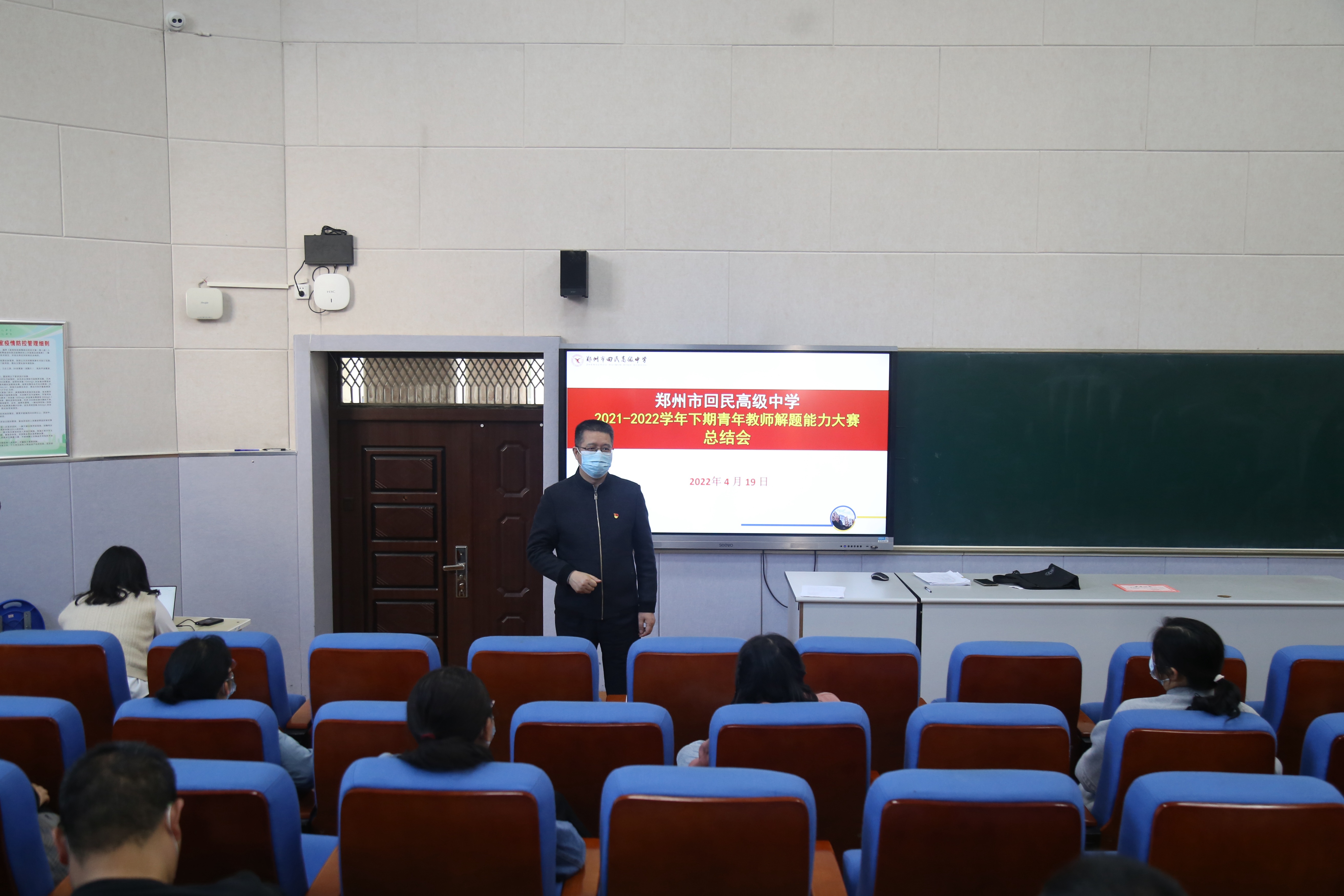 4月19日下午,郑州市回民高级中学在学校东阶梯教室进行了2021-2022学年下期青年教师解题能力大赛总结会。参加解题比赛的30名青年教师、副校长夏向阳、课程教学处副主任赵杰等人参加会议,会议由课程教学处副主任徐两省主持。