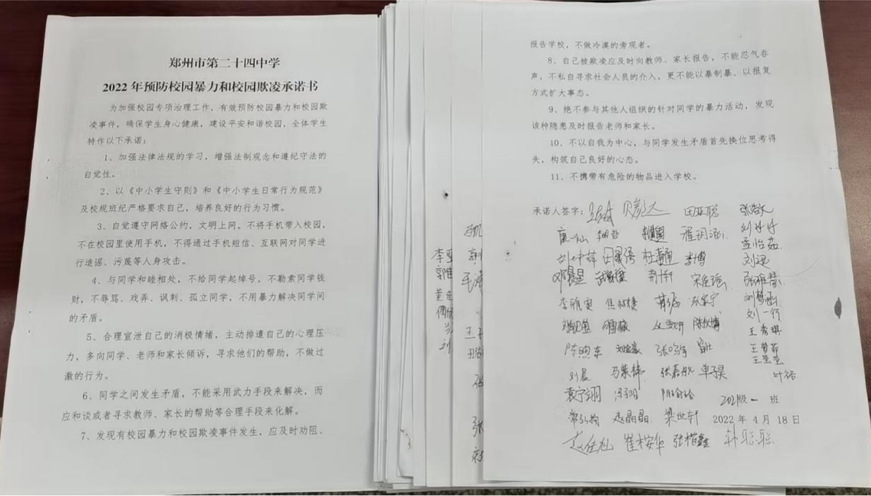该校还利用升旗仪式进行了校园欺凌和暴力防治专题教育,薛成柱做了《预防校园欺凌,共建和谐校园》主题教育演讲,在师生中反响很大,取得了预期的效果。郑州24中全年级在下午召开主题班会,对《中华人民共和国未成年人保护法》《中华人民共和国预防未成年人犯罪法》等法律进行宣传解读,深入开展思想道德教育、法治教育、心理健康教育,引导学生正确使用网络,自觉抵制不良网络信息、影视节目、网络游戏等侵蚀影响,引导学生养成良好思想品德和行为习惯。在24中各班的预防校园欺凌主题板报上,有各种校园欺凌的示例和话语,让学生了解了校园欺凌的含义,防止遇到伤害。为有效预防校园暴力和校园欺凌事件,确保学生身心健康,建设平安和谐校园,全体学生特作预防校园欺凌承诺,并签署《预防校园暴力和校园欺凌承诺书》。