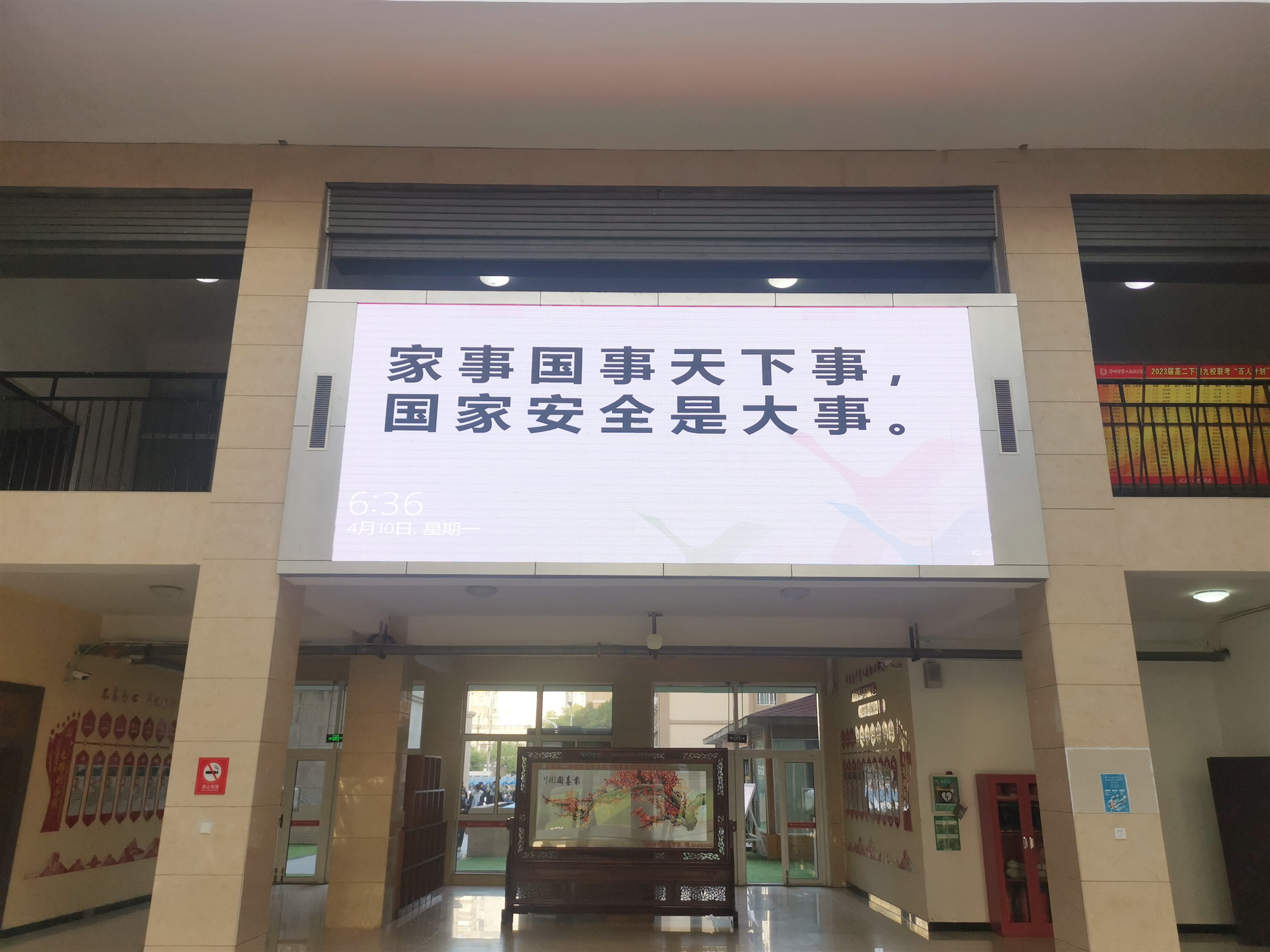 郑州市第二高级中学教学楼大厅宣传国家安全教育电子屏幕