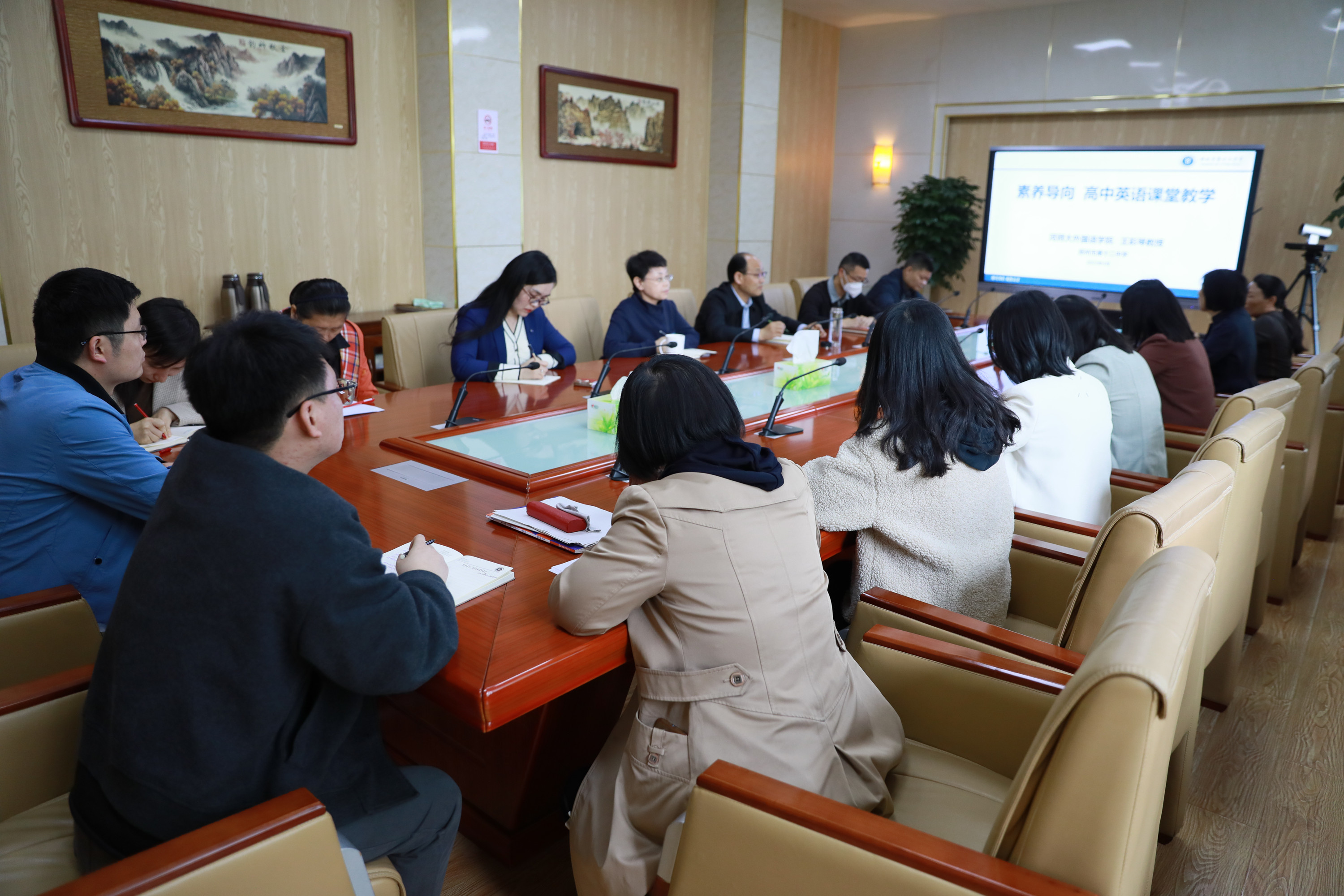 开方——优化提升。王彩琴结合听诊、把脉结果,为英语组教师作主题为《素养导向·高中英语·课堂教学》的英语学科教学指导。郑州12中校长孟天义、党委书记陈立新带头参与其中。王彩琴从教育素养到教育情怀,从教育智慧到高效课堂,给授课英语学科建设提出可操作性的合理化意见或建议。她的高屋建瓴为与会教师指明方向,打开从知识到素养的教育教学新思路,也为英语组教师带来一场“实践与思辨”的饕餮盛宴。