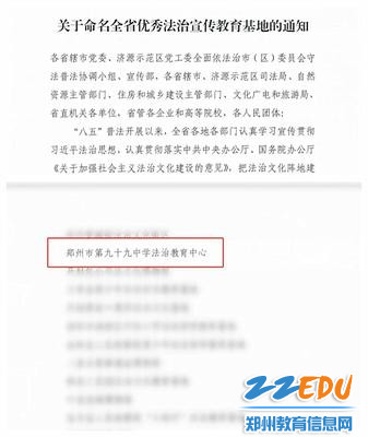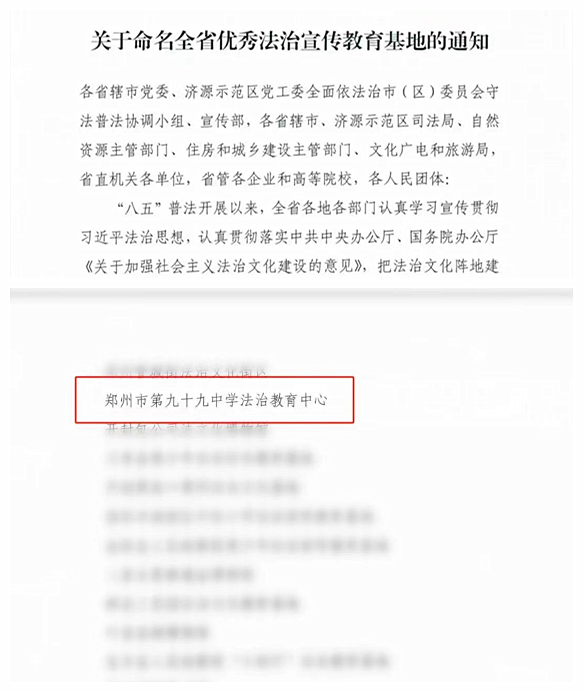 郑州99中法治教育中心被命名为全省优秀法治宣传教育基地